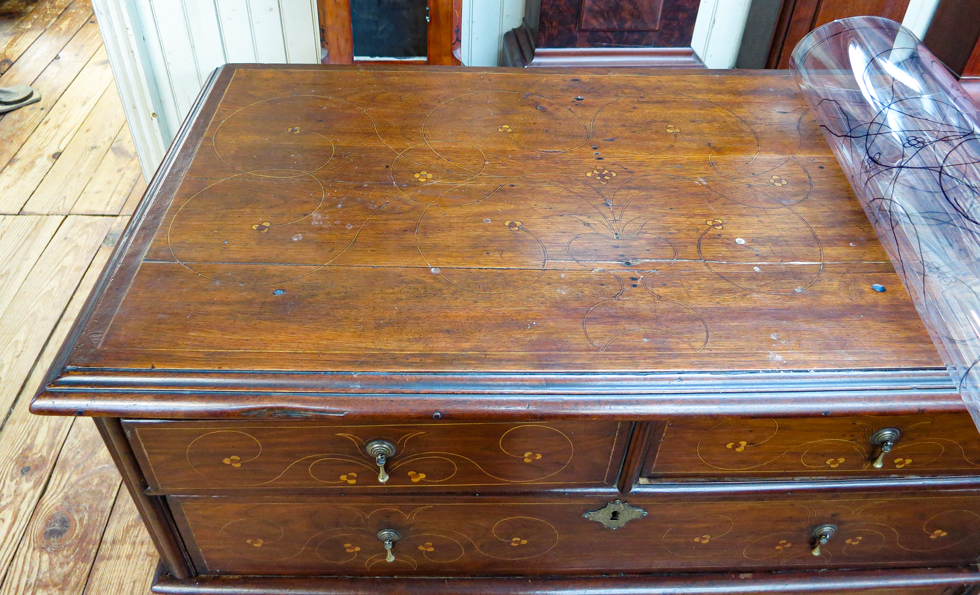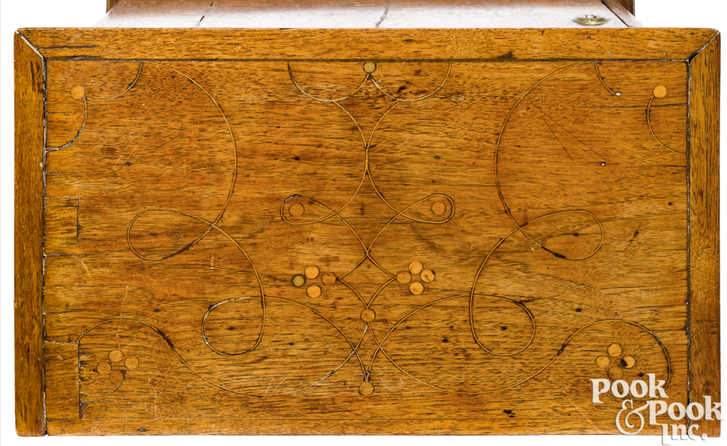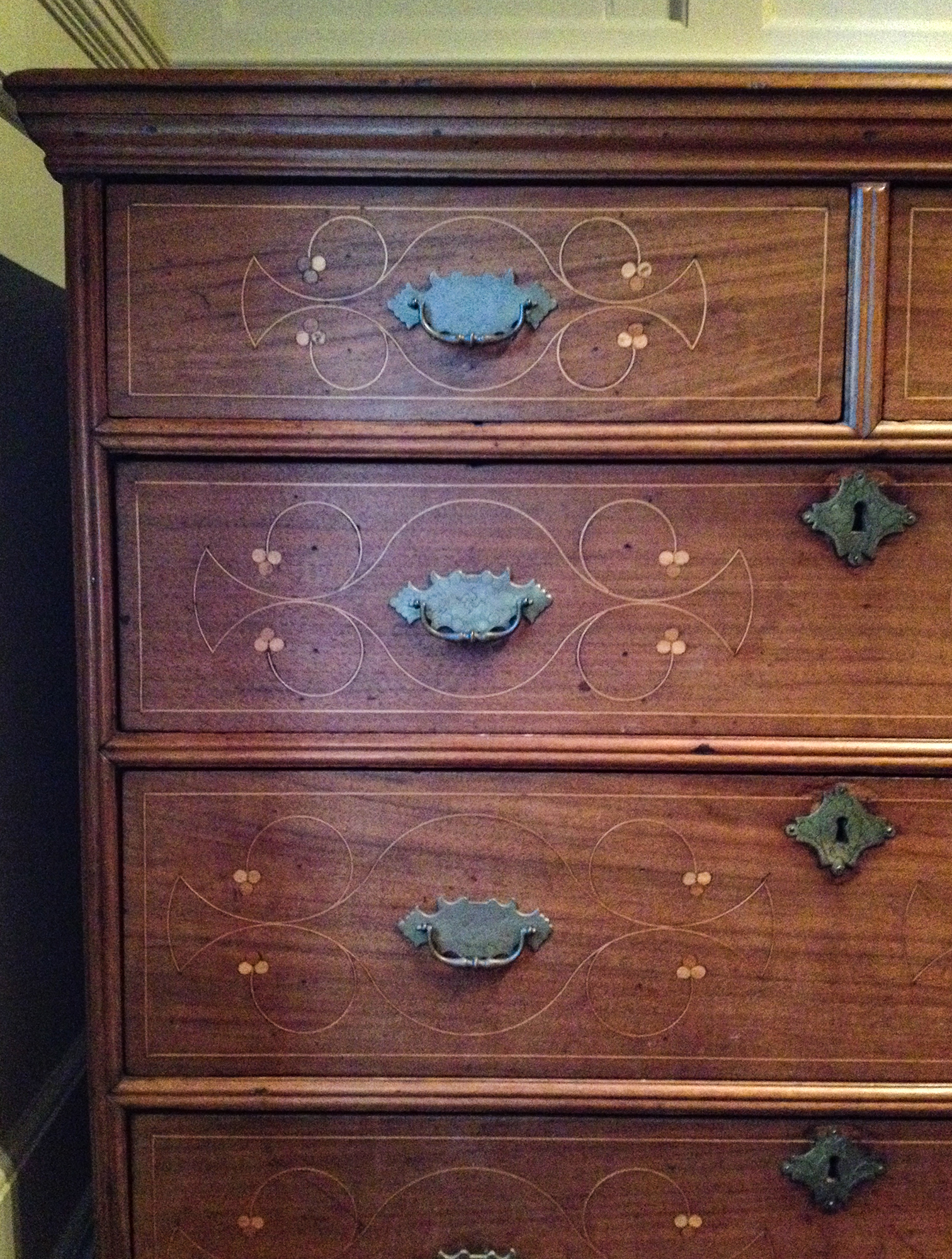 There are several distinctive characteristics of this group of line and dot inlaid furniture that may have originated in the Delaware River Valley. First, dots are inlaid singularly or in clusters of four. Dots inlaid on objects documented and attributed to Chester County are typically inlaid in clusters of three and it is rare to see single inlaid dots. Second, the stringing is laid out with numerous compass point settings used to generate the compound curves of increasing or decreasing spirals which evoke volutes. Just two or three compass settings are used to create an inlay element on most Chester County objects.