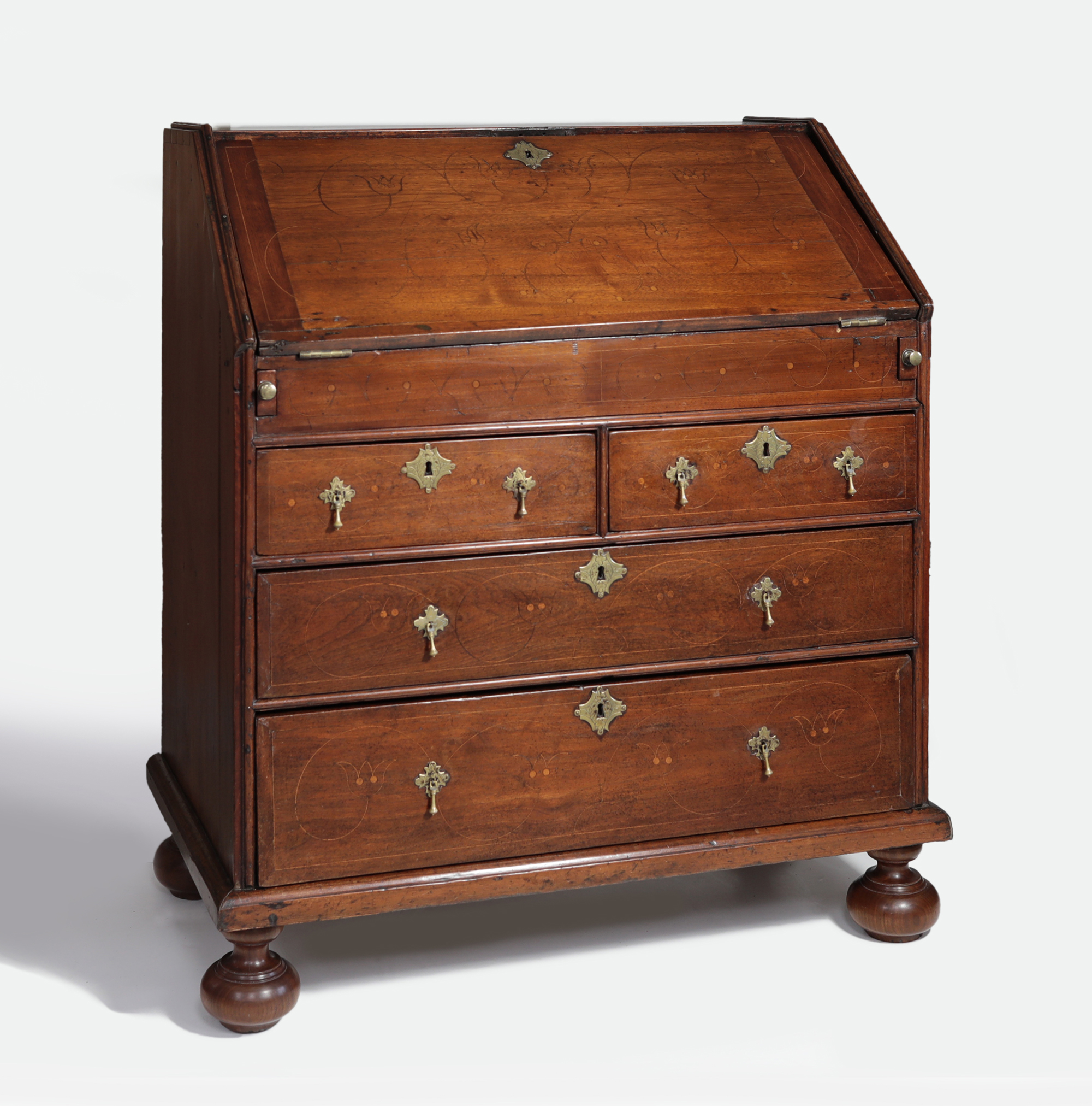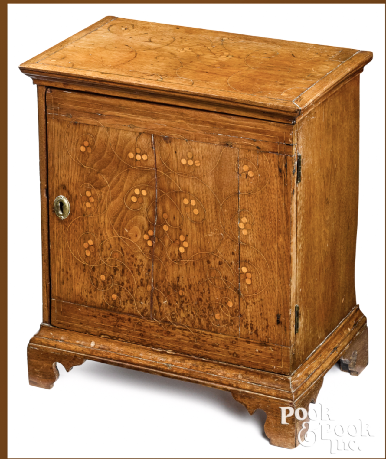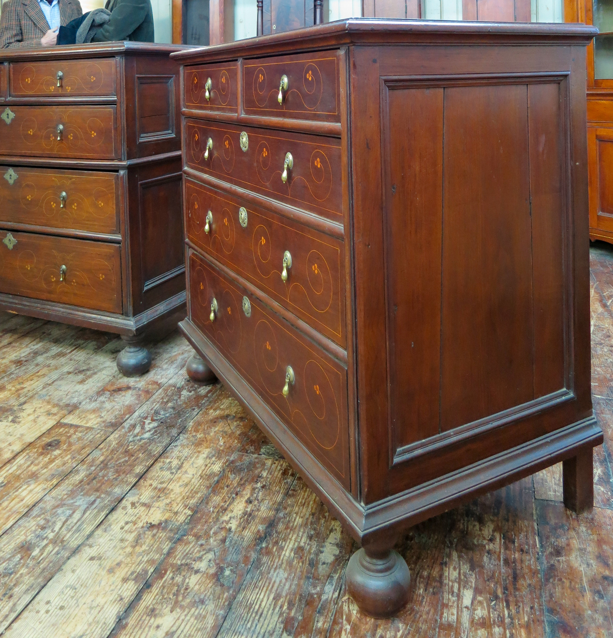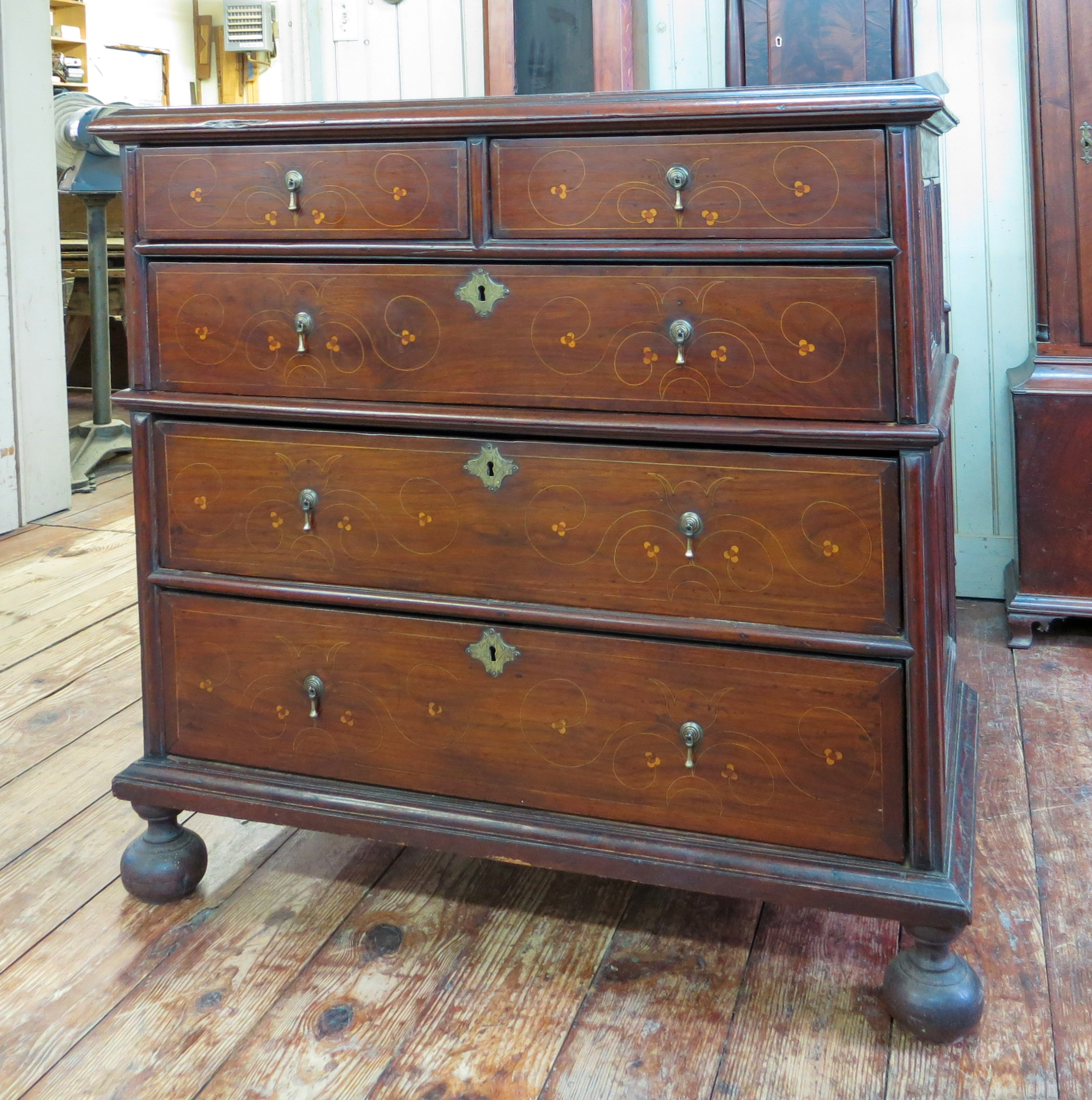 There are several distinctive characteristics of this group of line and dot inlaid furniture that may have originated in the Delaware River Valley. First, dots are inlaid singularly or in clusters of four. Dots inlaid on objects documented and attributed to Chester County are typically inlaid in clusters of three and it is rare to see single inlaid dots. Second, the stringing is laid out with numerous compass point settings used to generate the compound curves of increasing or decreasing spirals which evoke volutes. Just two or three compass settings are used to create an inlay element on most Chester County objects.