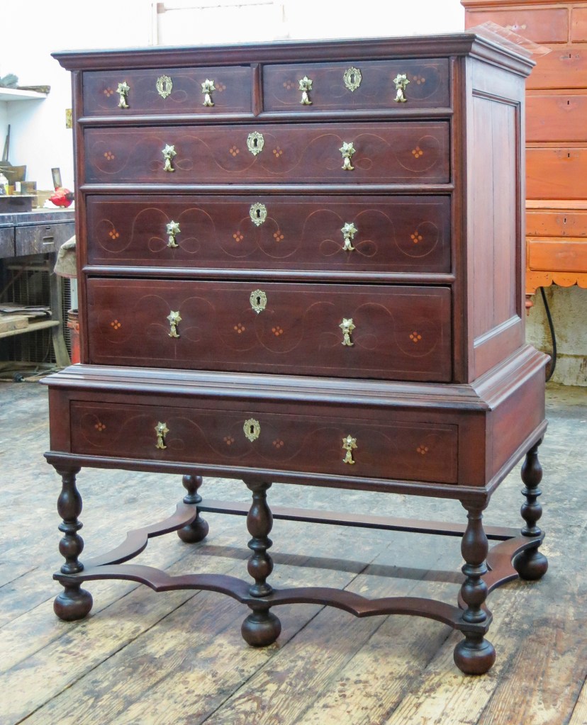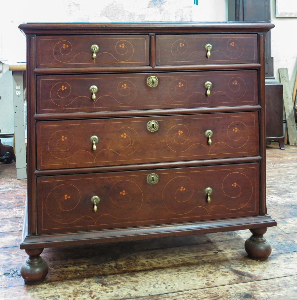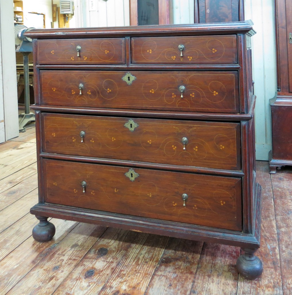 Various regions in Southeastern Pennsylvania have traditions of inlaying furniture with a combination of lightwood stringing and round elements. (Often called “berries” today but the term “dots” may have been in use in the eighteenth century. More on this in the next post.) Objects made of black walnut having line and dot inlay made in the first half of the 18th century have traditionally been attributed to Chester County, Pennsylvania. Groups of objects have even been attributed to specific Chester County townships and individual makers. Rarely have any of these inlaid objects been attributed to Philadelphia. However, a small group of objects from several different makers showing a fundamentally different approach to line and dot design from the objects documented to Chester County are constructed with secondary woods of hard pine, red gum, and Atlantic white cedar. These are secondary wood species used in furniture made in there Delaware River Valley/Philadelphia region. Objects documented and attributed to Chester County are typically constructed with yellow poplar and oak secondary wood species and the drawer linings are most often thicker than Philadelphia work. I believe we need to consider the possibility that some of these line and dot inlaid objects were produced by Philadelphia or West Jersey cabinetmakers.