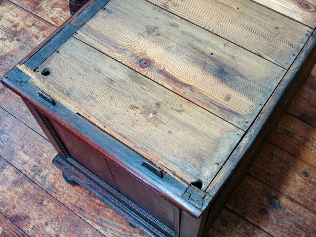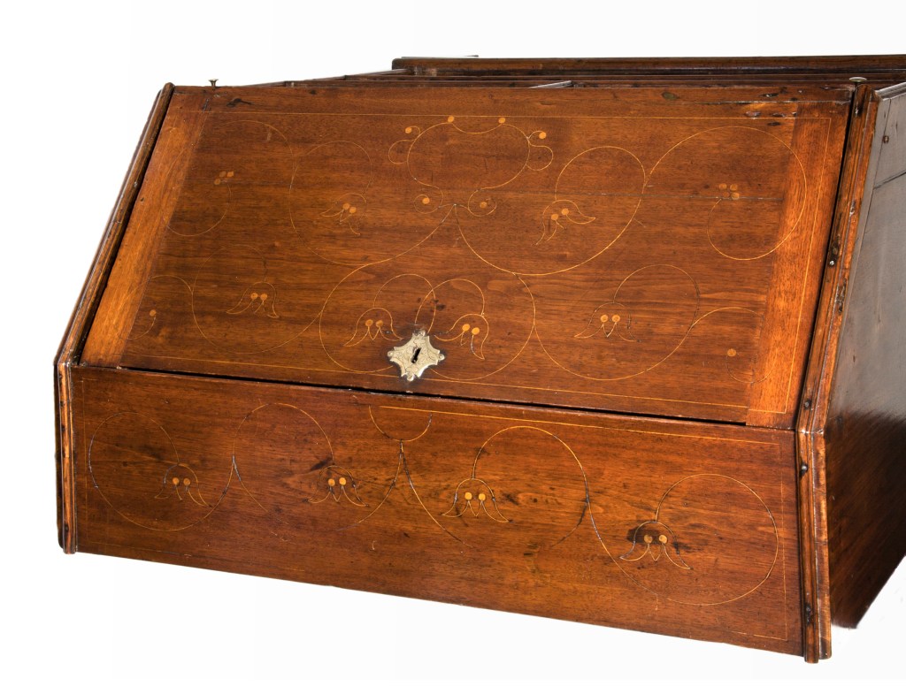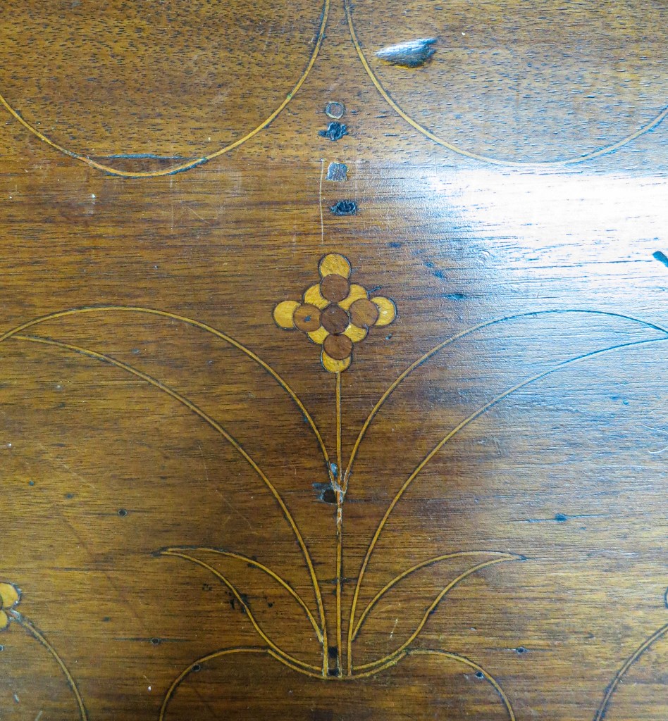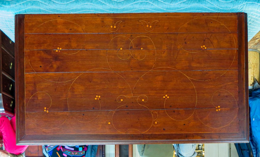 Top of the chest after restoration. The inlaid design has an urn and flower designs related to the desk seen above.