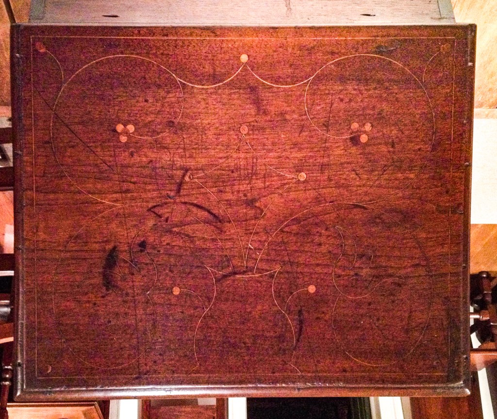 Detail of the lid and top of the desk in the previous image. Delaware River Valley, 1715-1735. Black walnut, hard pine, Atlantic white cedar, red gum, white oak. Dietrich American Foundation. The lid is is inlaid with single and clusters of four lightwood dots. A vase or urn, stylized flowers, and vines are depicted with lightwood stringing. 14 different compass settings are used to generate the design of the lid.