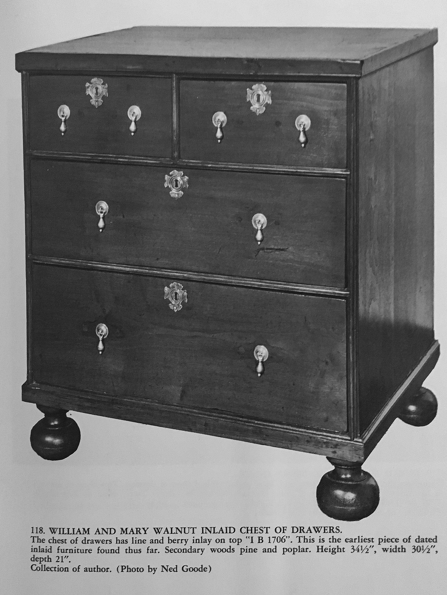 Chest of drawers. Delaware River Valley, possibly Philadelphia. 1706. Black walnut, hard pine, Atlantic white cedar.