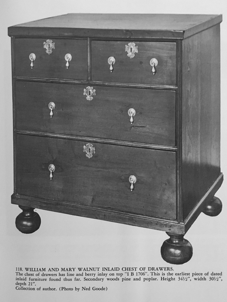 Chest of drawers. Delaware River Valley, possibly Philadelphia. 1710-1730. Black walnut, hard pine, Atlantic white cedar. Private collection.