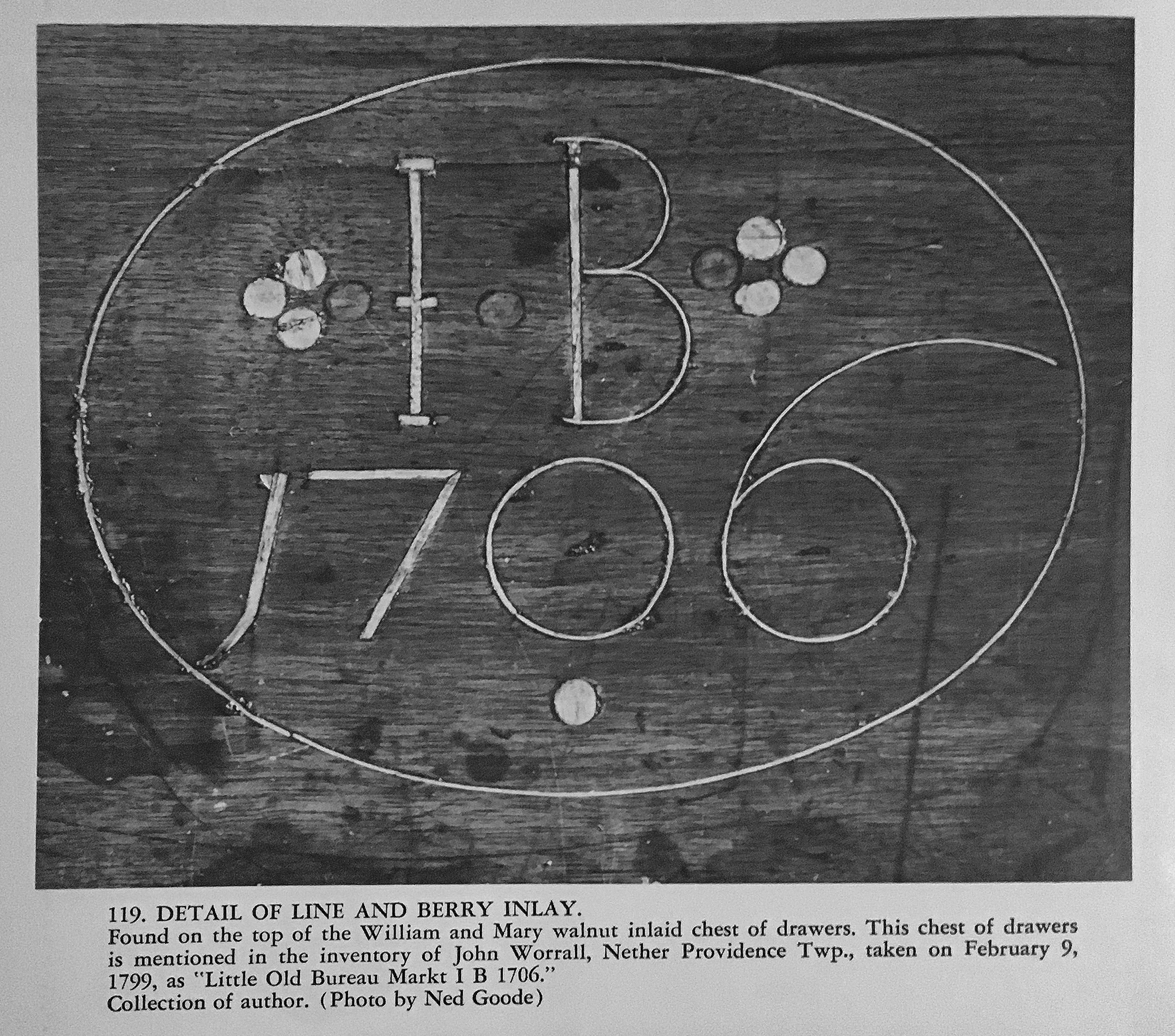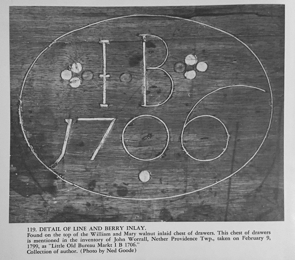 One reason that “line and berry” pieces heretofore have been ascribed to Chester County is that the original owners for several of them are known to have lived there, such as Hugh Boyd (d.1754) of West Nottingham Township. His name is inlaid on a hat box with line and eight-berry inlay. Lee Ellen Griffith related such inlay to a blanket chest with similar eight-berry inlay, bearing the inlaid initials of John and Johanna (England) Townsend of East Nottingham Township and “1741,” the date of their marriage there.