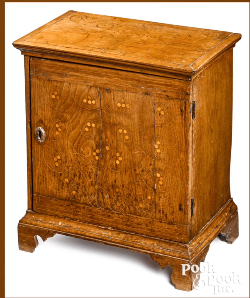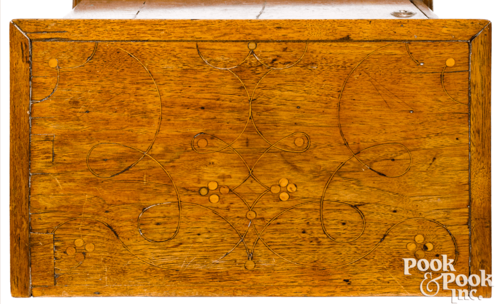 Researching these objects is an on-going project. As they don’t exist in great numbers I have been able to examine nearly all the objects that might be tentatively attributed to the Delaware River Valley/Philadelphia region (clusters of four dots in combination with single dots, designs made with numerous compass settings, increasing and decreasing radii spiral stringing, and secondary woods seen in documented Philadelphia furniture – hard pine, Atlantic white cedar, red cedar, gum.) Many more examples of work from Chester County cabinetmakers survive, many are dated, and numerous examples have been attributed to makers. More need to be examined to determine secondary wood species and construction details. Of the Delaware River Valley/Philadelphia group, only one object is dated and none are documented to a maker. The following images highlight key aspects of this fascinating group of objects.
