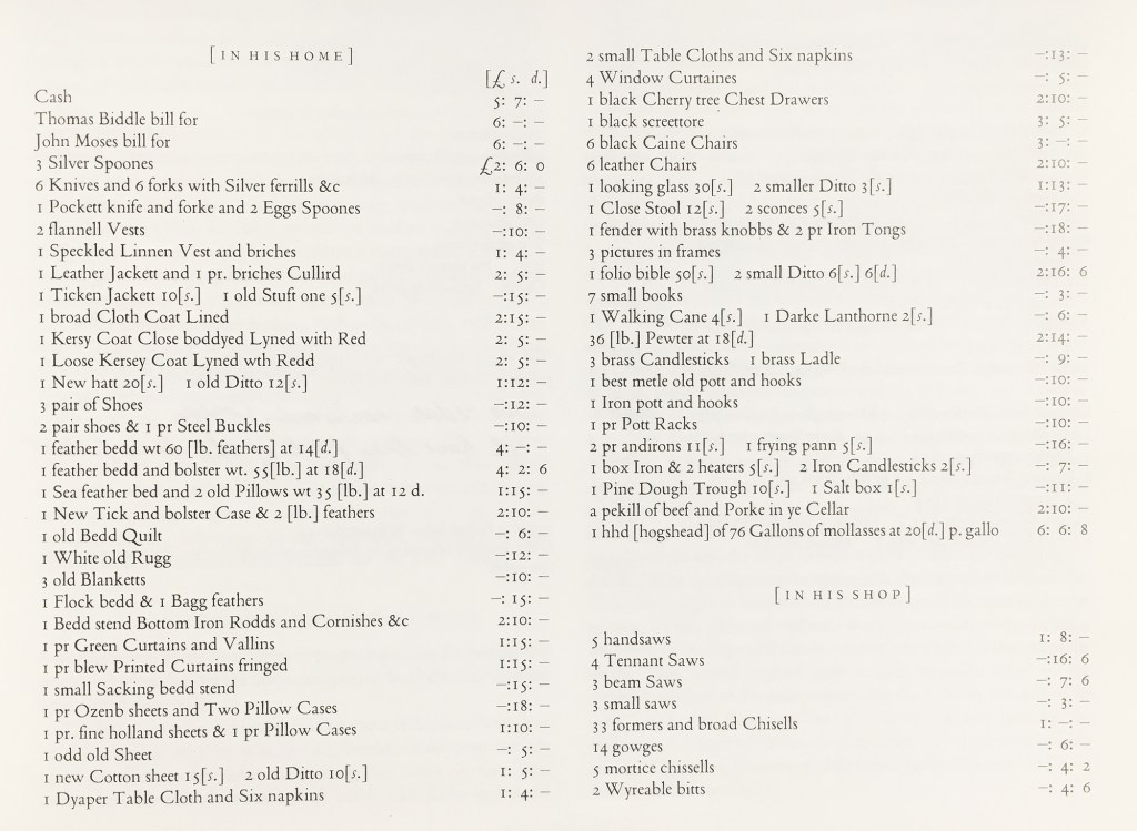 He was in the middle of his career when he died and the inventory is a snapshot of a working joiner’s possessions in his home and shop. (Two different birth dates have been recorded for Plumley, he was either 34 or 42 when he died.) The great assortment of tools, wood, and unfinished work speak to success in his trade. Three benches listed in the inventory were used by Plumley and his two journeymen Isaac and David whose time to serve was credited at 18 and 12 pounds respectively.