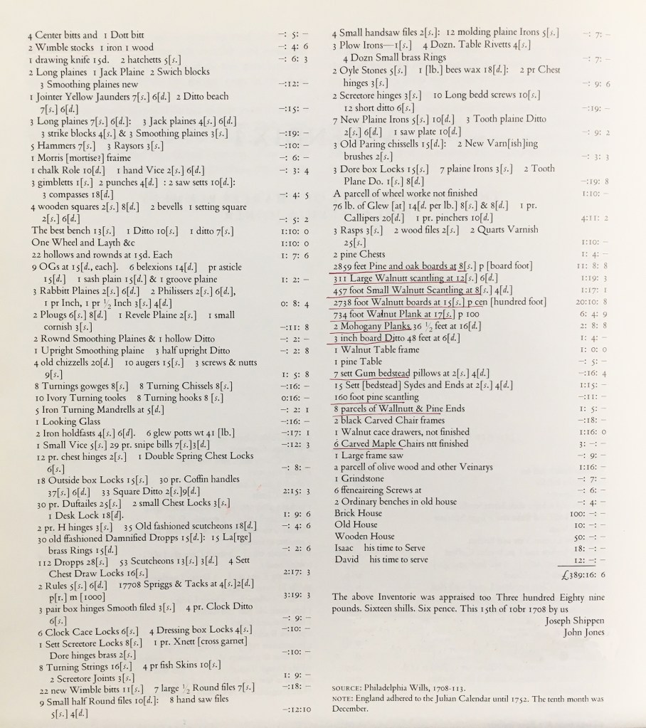 The extensive probate inventory of the joiner Charles Plumley (d. 1708, Philadelphia) is well known to furniture historians. A transcription can be found in Benno M. Forman, American Seating Furniture, 1630–1730 [New York: W. W. Norton, 1988], app. 1.