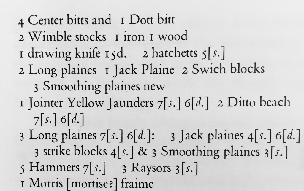 In the shop, saws are the first tools to be inventoried followed by various chisels and gouges in terminology recognizable to woodworkers today – handsaws, tenon saws, firmer, broad, and mortise chisels. This is followed by boring tools – in modern parlance, brace and bits. Two braces are described as “Wimble stocks”, one made of iron and one of wood.