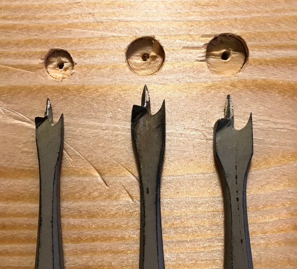 Hummel describes them as tenon-cutting bits due to the diameter of the metal cutters. They were clearly designed as bits as the wood shanks the cutters are fixed to are tapered to be used in a brace. A smaller version of the Dominy bits would be the perfect tool to create the dot inlays on the chests and boxes in the previous post.