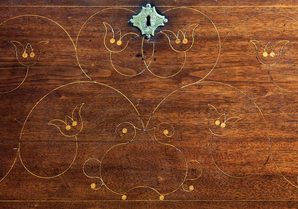 That the “Dott bitt” in Plumley’s inventory was used to cut out the dots to be inlaid on chests and boxes is speculation. We can never know what the “Dott bitt” looked like or how it was used. Joseph Shippen and John Jones who took Plumley’s inventory were clearly well acquainted with the cabinetmaking trade – one or both may have cabinetmakers themselves. They tantalize us with the possibility that they described a special-purpose tool “for which no illustration or document can be found.” (Hummel)