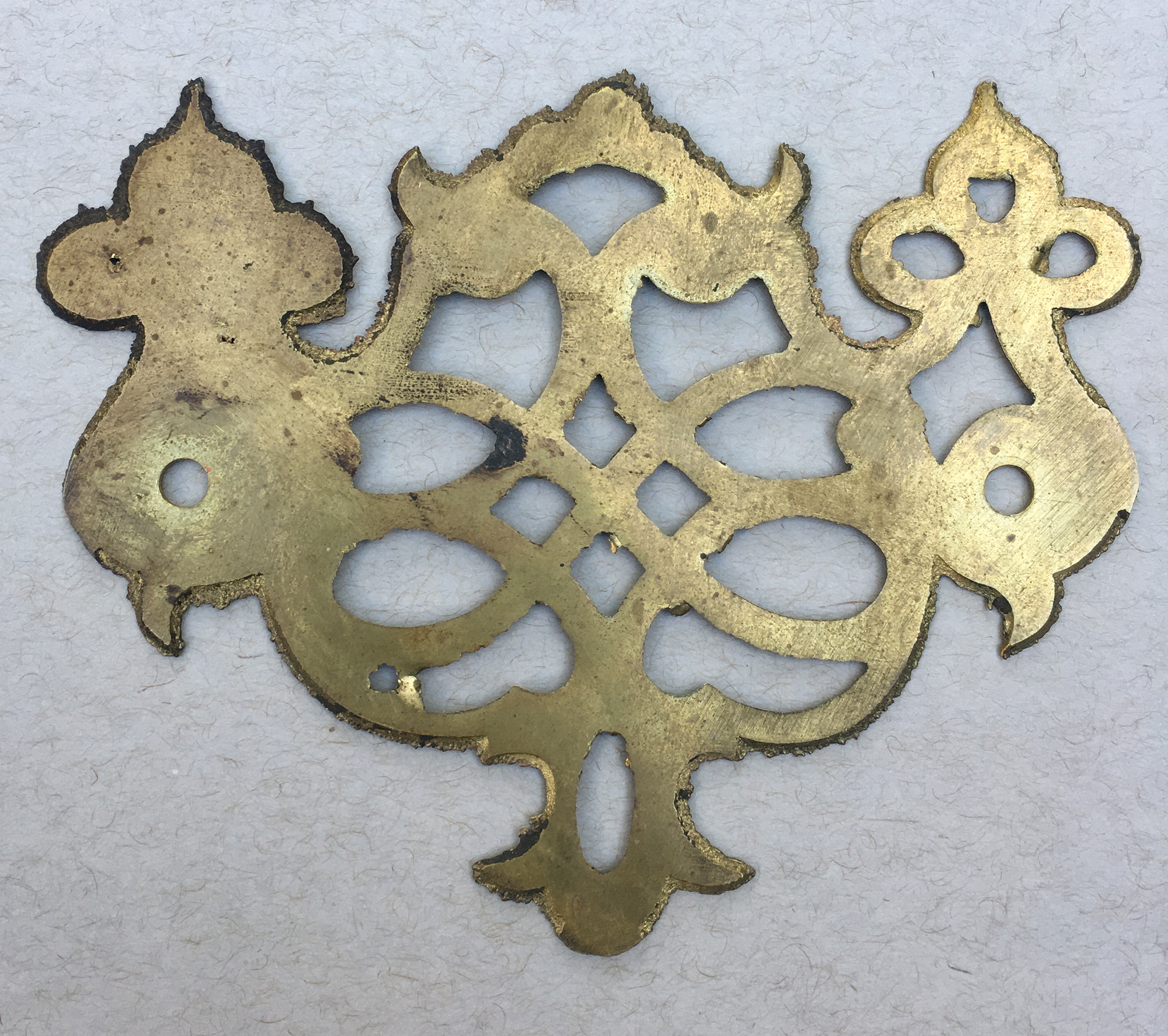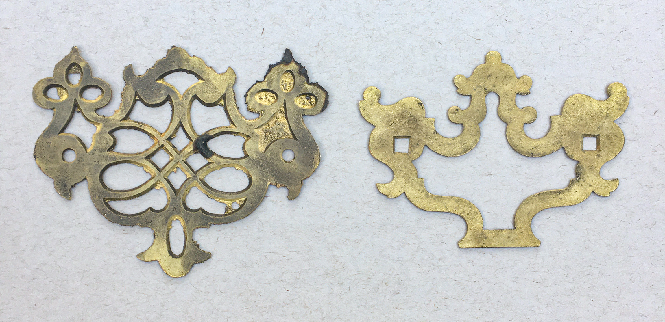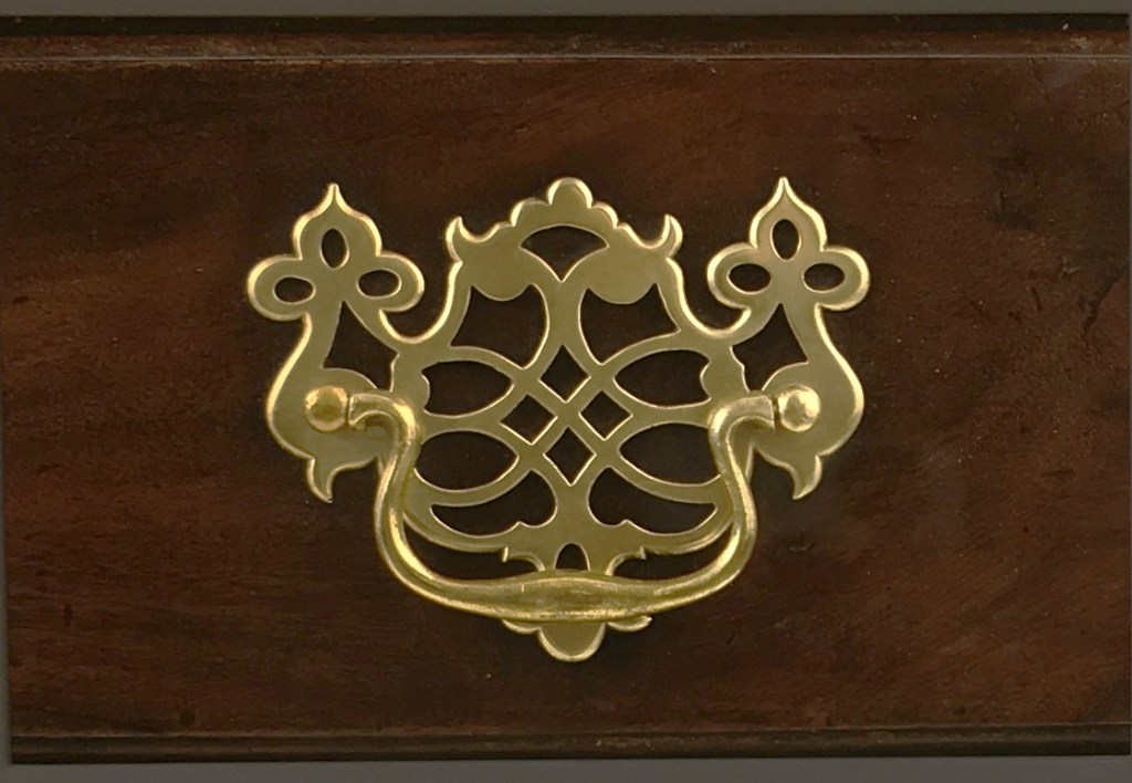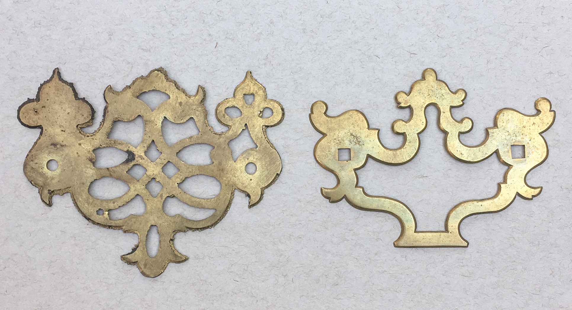We would make a pattern from a one-eighth inch thick piece of plexiglass that matched an original plate or a witness mark on a drawer front. We increased the size of our pattern by a couple of percent to take the brass shrinking as it cooled into account. The pattern was mailed to Dave who made sand castings of the pattern so the backs of the reproduction plates would have the sand-cast appearance just as the originals. He then milled the plates to the thickness that was needed and hand-filed the edges. When we got the new plates back from Dave they looked just like a new original might the day it was made. We would then distress the new plates to match the wear patterns of the surviving originals if there were any or decide the extent of the wear we believed the brass on a certain object should have if all the originals were missing.