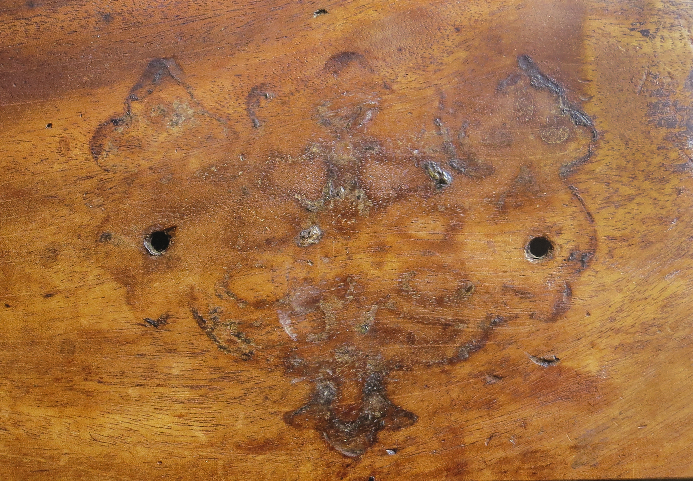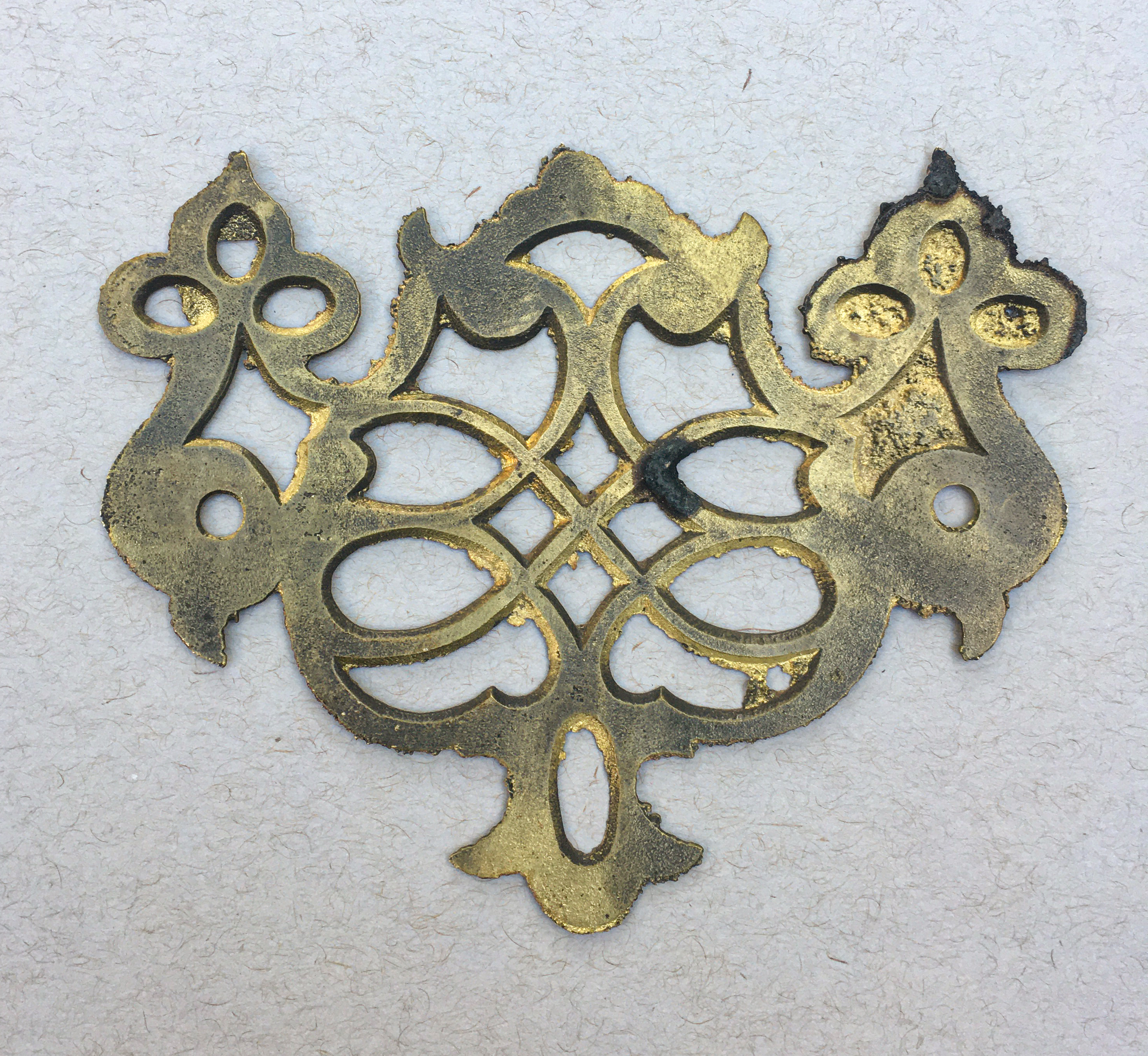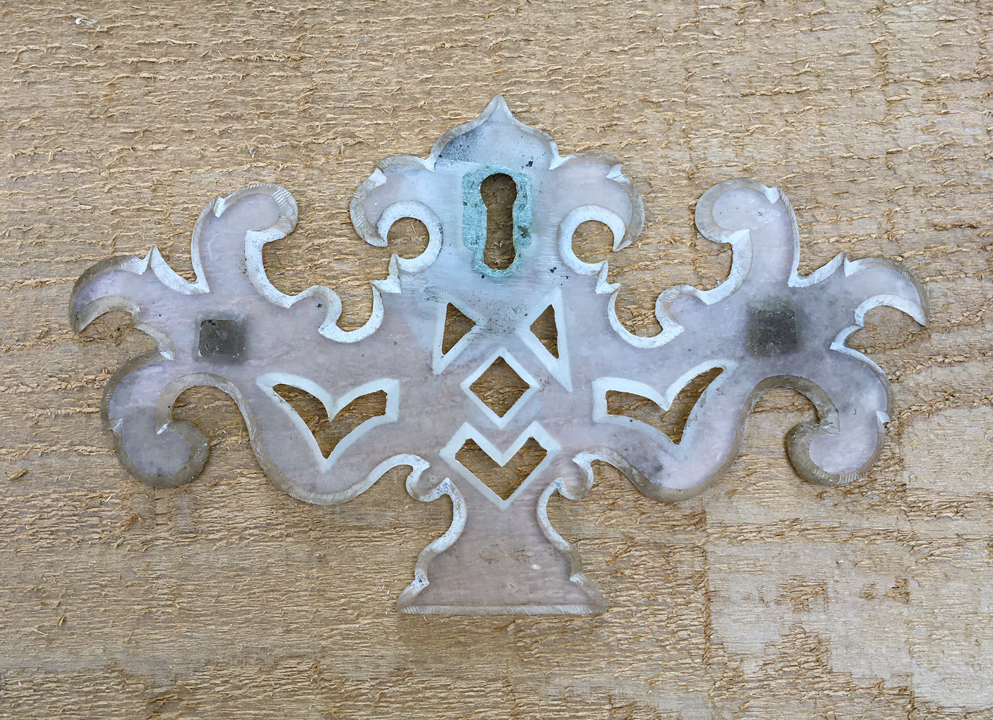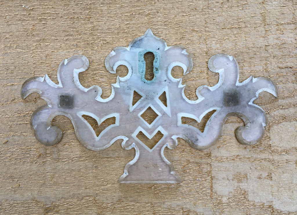 We would make a pattern from a one-eighth inch thick piece of plexiglass that matched an original plate or a witness mark on a drawer front. We increased the size of our pattern by a couple of percent to take the brass shrinking as it cooled into account. The pattern was mailed to Dave who made sand castings of the pattern so the backs of the reproduction plates would have the sand-cast appearance just as the originals. He then milled the plates to the thickness that was needed and hand-filed the edges. When we got the new plates back from Dave they looked just like a new original might the day it was made. We would then distress the new plates to match the wear patterns of the surviving originals if there were any or decide the extent of the wear we believed the brass on a certain object should have if all the originals were missing.