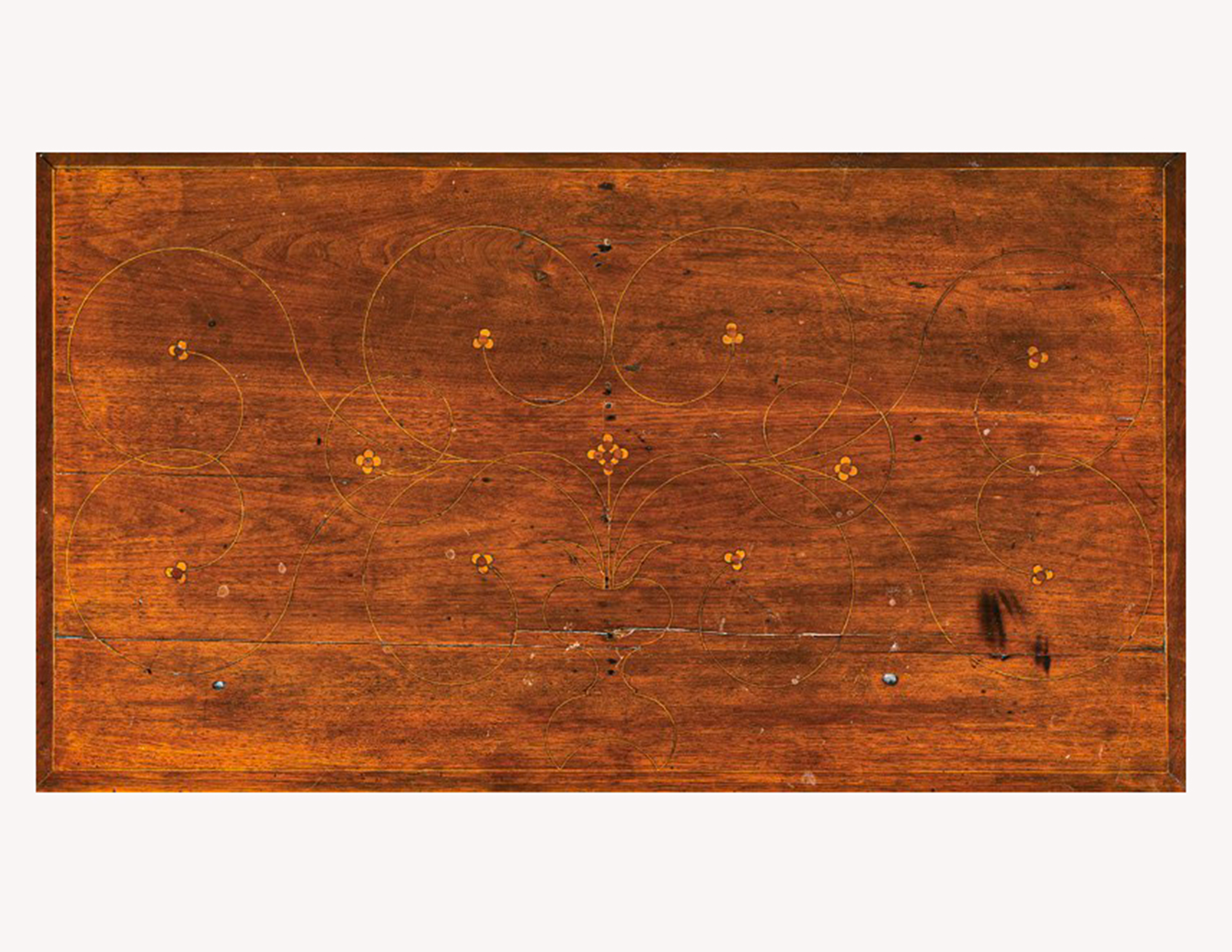 The on-line catalogue does not illustrate the tops of these three objects but the large area of the top boards, as well as the slant lid of the Dietrich American Foundation desk, allows for some of the the most elaborate and inventive line and dot designs produced in the Delaware River Valley. Interestingly, when any of this small group of objects with single and clusters of four dots and complicated stringing inlay designs comes to auction, the fact that their tops, in addition to the drawer fronts, have an inlay design is remarked upon as unusual as this is rarely seen on objects with line and dot inlay documented to Chester County. But when examined as a group it is entirely unremarkable as the top of every one of these objects has a lively, energetic inlay design. (To date, this group includes the three objects discussed above owned by Bill du Pont now at Sotheby’s, the desk in the collection of the Dietrich American Foundation, a chest of drawers in a private collection, sold at Pook & Pook, Inc., another chest of drawers in a private collection inlaid with the date 1706, a box in the collection of Winterthur Museum, and a spice chest sold at Pook & Pook, September 30, 2021.)