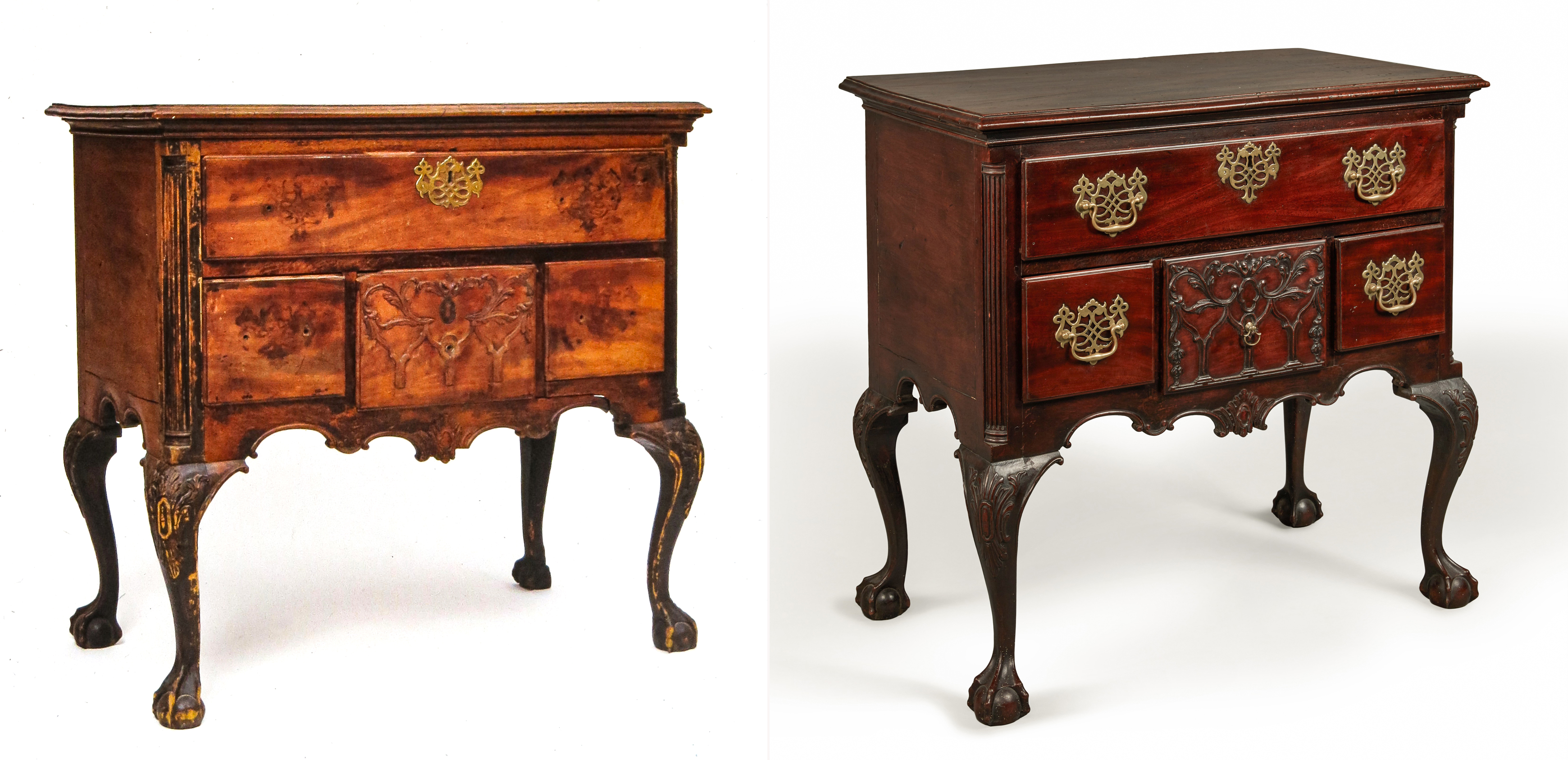 Dressing table. Philadelphia, Pennsylvania, circa 1770. Left, before treatment in 1993. Right, Sotheby’s photo, 2021.