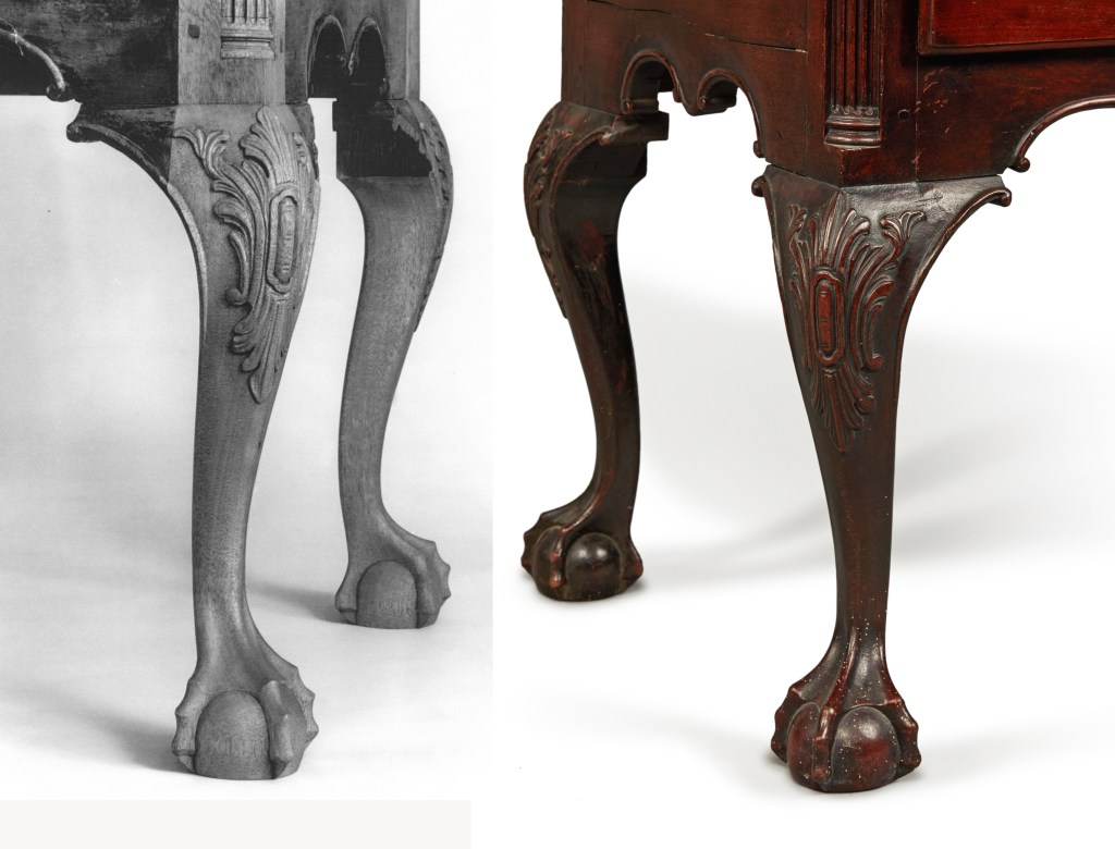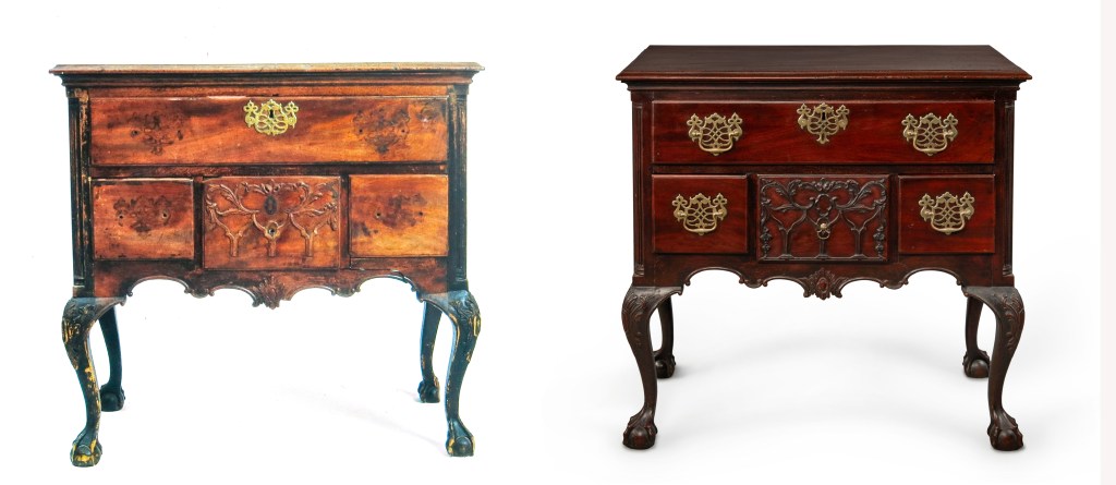 Dressing table. Philadelphia, Pennsylvania, circa 1770. Left, during treatment in 1993. Right, Sotheby’s photo, 2021.
