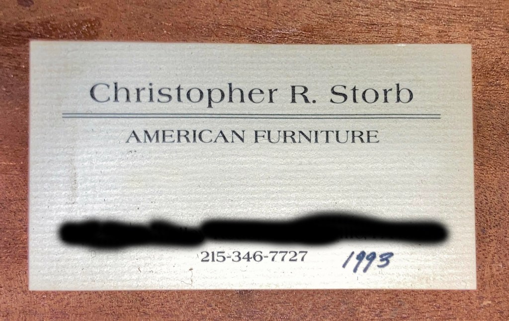 Earlier this year, Eric Gronning, Senior Vice President, Head of Department, Americana, Sotheby’s, found the business card I had glued on an interior surface of the carcase of the dressing table and contacted me for any information I had about the dressing table. I would find ways to identify my extensive restoration projects that might be hard to decipher in the future due to the fool-the-eye treatments we were capable of. I’m well pleased Eric found my card and reached out. 28 years later, the simple act of gluing that card, which took 10 seconds, did what it was supposed to do.
