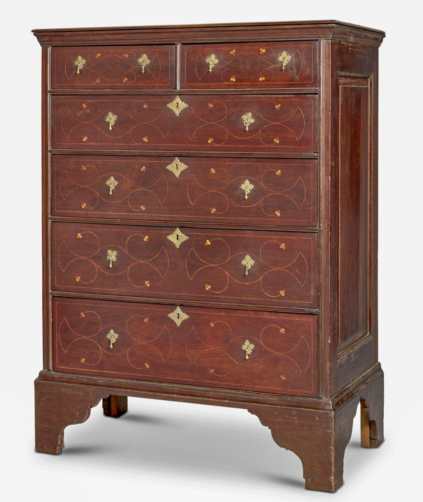 Tall chest of drawers. Black walnut with line-and-dot inlay. Chester County, Pennsylvania. Circa 1745. Lot 285, The William K. du Pont Collection.