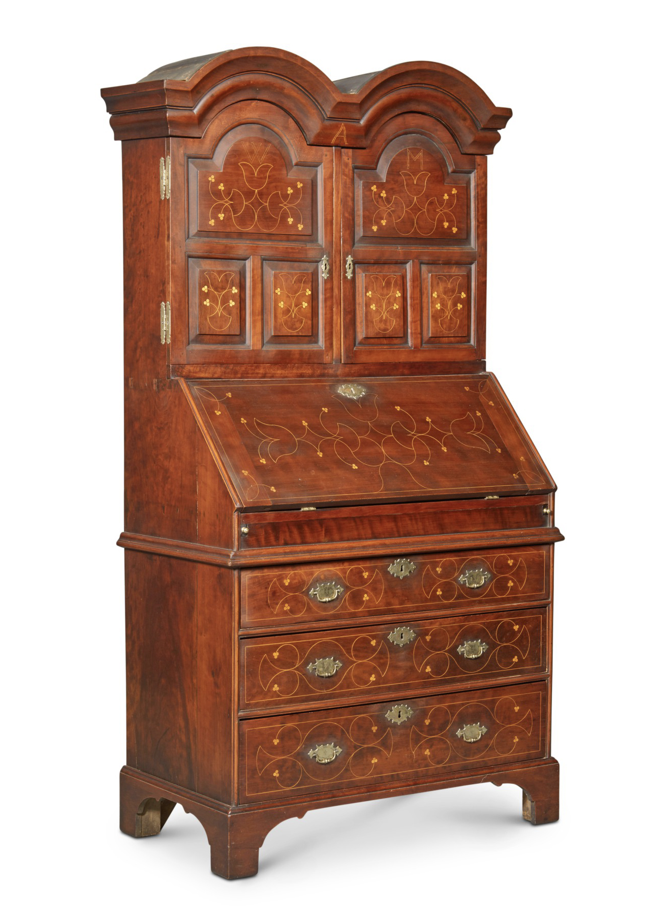 Desk and bookcase. Black cherry with line-and-dot inlay. Nottingham area, Chester County, Pennsylvania. Circa 1745. Lot 217. The William K. du Pont Collection.