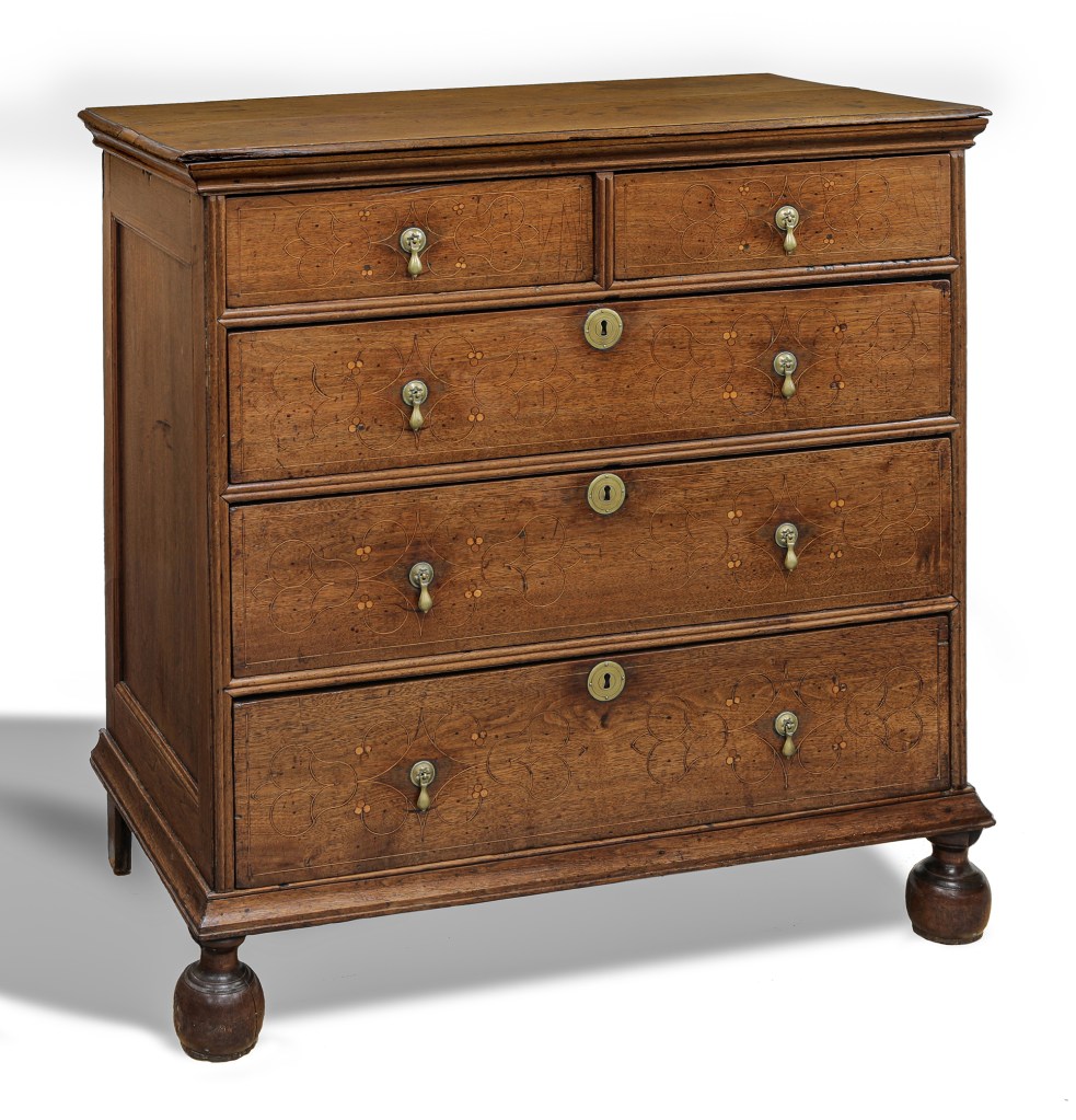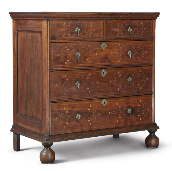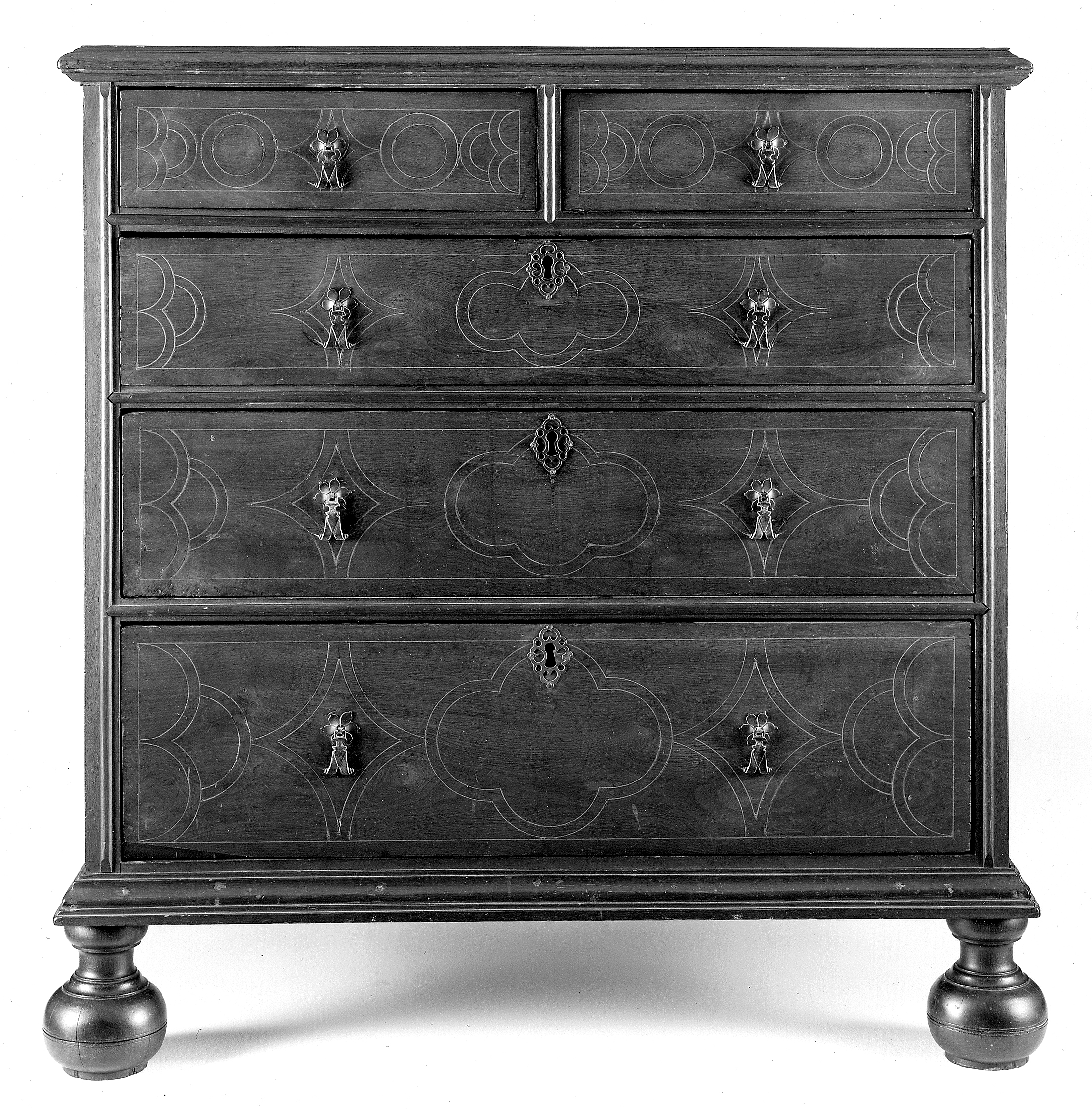 Chest of drawers with line and dot inlay. Chester County, Pennsylvania. 1710-1720. Black walnut, yellow poplar. Replaced feet and brass pulls. Charles L. Venable, American Furniture in the Bybee Collection, University of Texas, Austin, 1989, pp. 2-3, cat. 1.