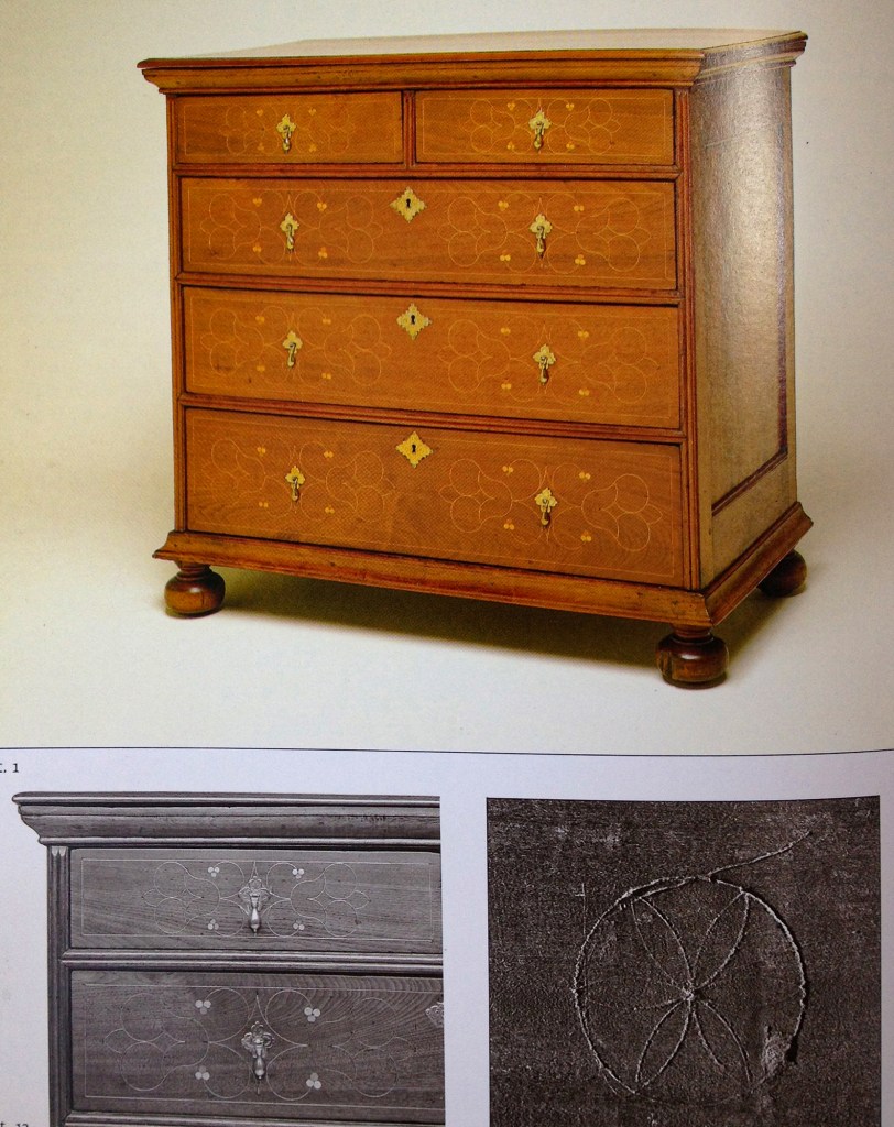 Simple stringing designs appear on a few surviving early eighteenth-century joined chests of drawers made in Southeastern Pennsylvania. The designs consist of straight lines and sections of circles, it’s easy to discern how the designs were laid out.