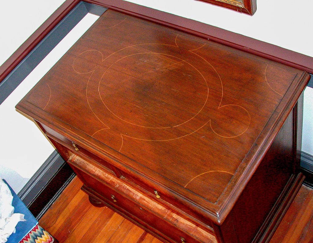 The layout of type of stringing design seen on these chests begins with a horizontal line drawn through the center of the drawer and a vertical line where the brass pull will be placed. One leg of the divider is placed where these lines intersect, the other leg is placed at the determined height of the central element as the first step in creating the design. Various means are used to deal with the graduated heights of the long drawers. The center element is typically enlarged, the other elements may or may not change in size. At times the two lower drawers have inlay designs of the same size, the ones above slightly smaller.