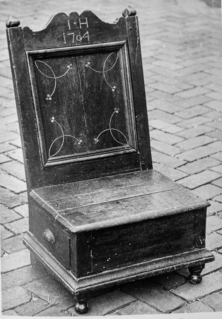 A single chair has pairs of arcs ending in three dots springing from the corners of the back panel. Initials and a date are inlaid in lightwood on the crest rail. The inlaid date is 1704 or 1714. Furniture historians disagree on whether the zero was changed to a 1 or vice versa. I have not personally examined the chair. In either case, this is likely one of the earliest dated inlay with stringing ending in a cluster of three dots.