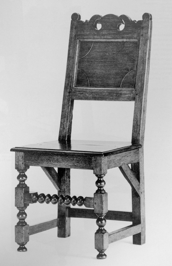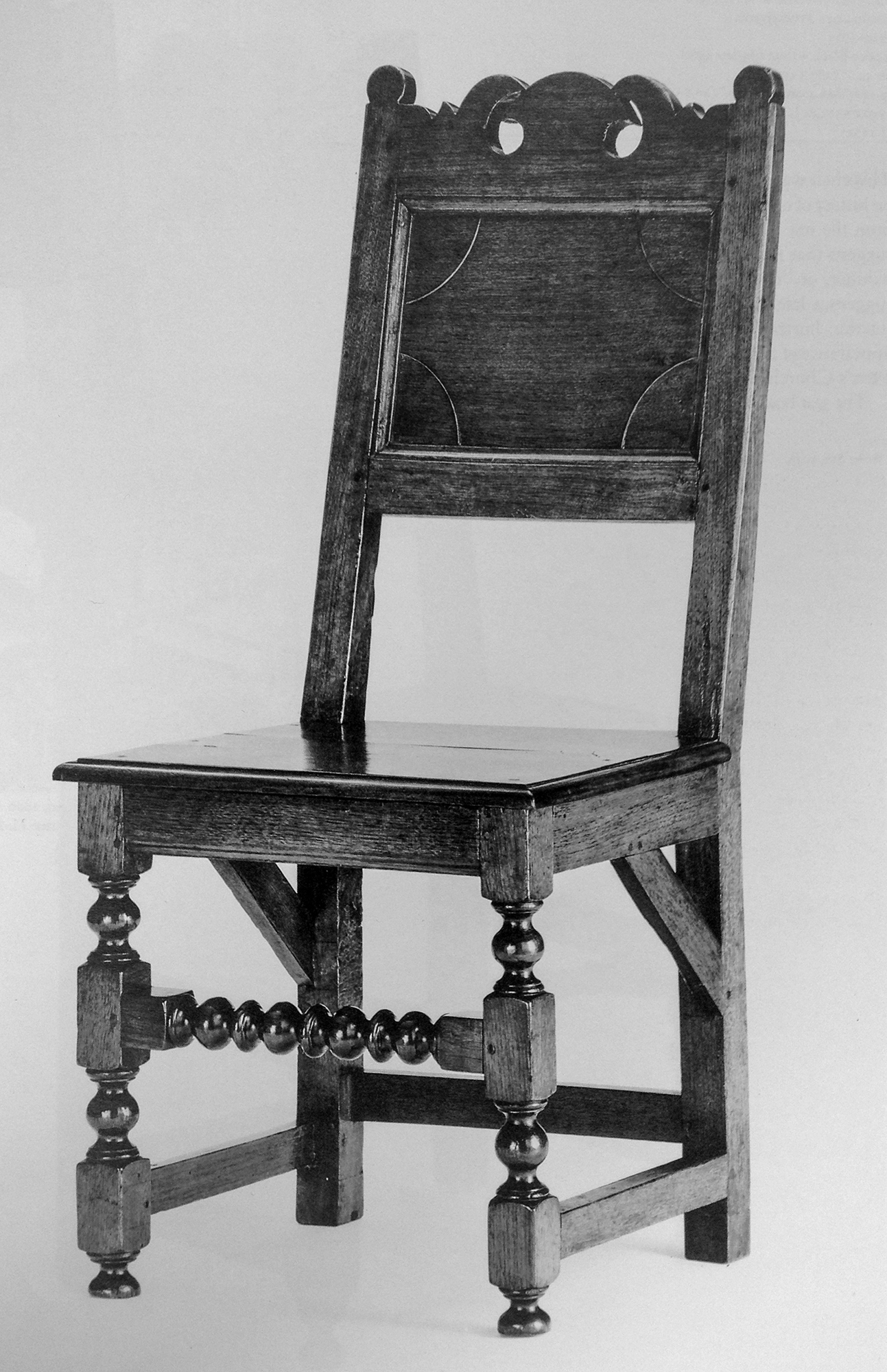 The simplest designs of line and dot inlay on Southeastern Pennsylvania furniture are found on framed, or wainscot, chairs. Several surviving chairs, possibly from the same set, have stringing in the form of a quarter of a circle inlaid in the corners of the back panel.