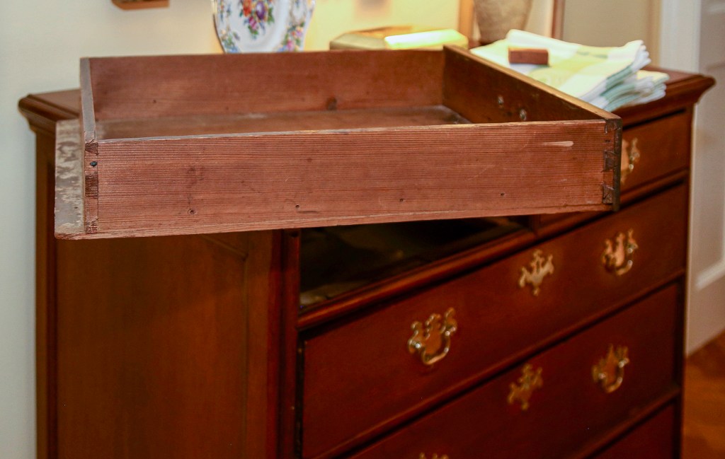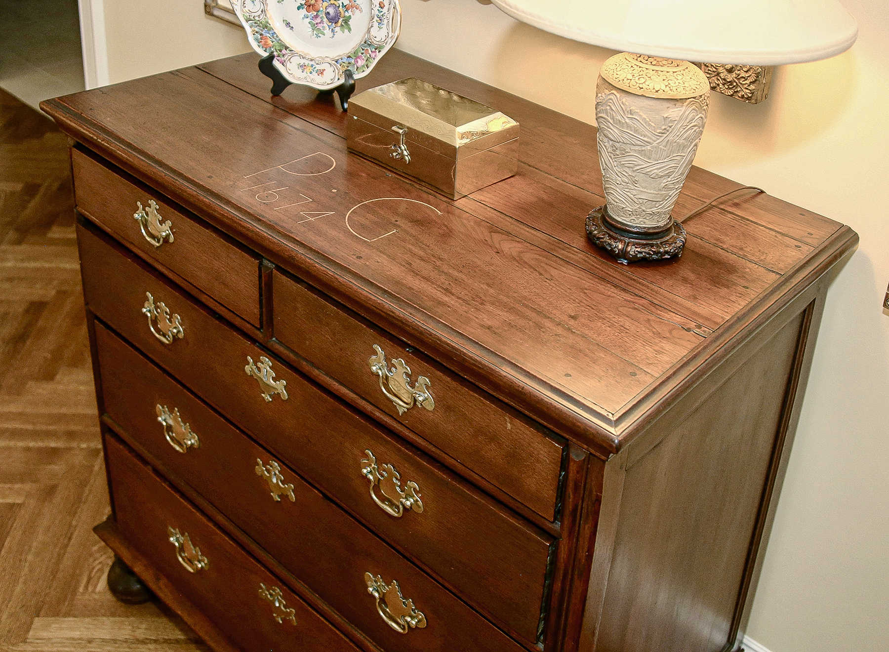 One chest of drawers has the lightwood initials “PG” with a single dot between them inlaid on the top. The early date may have been added later. It has hard pine drawer sides and backs and Atlantic white cedar drawer bottoms. The chest could date to the first decade of the eighteenth century.