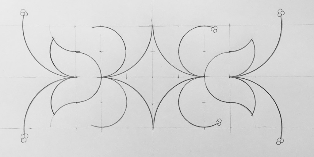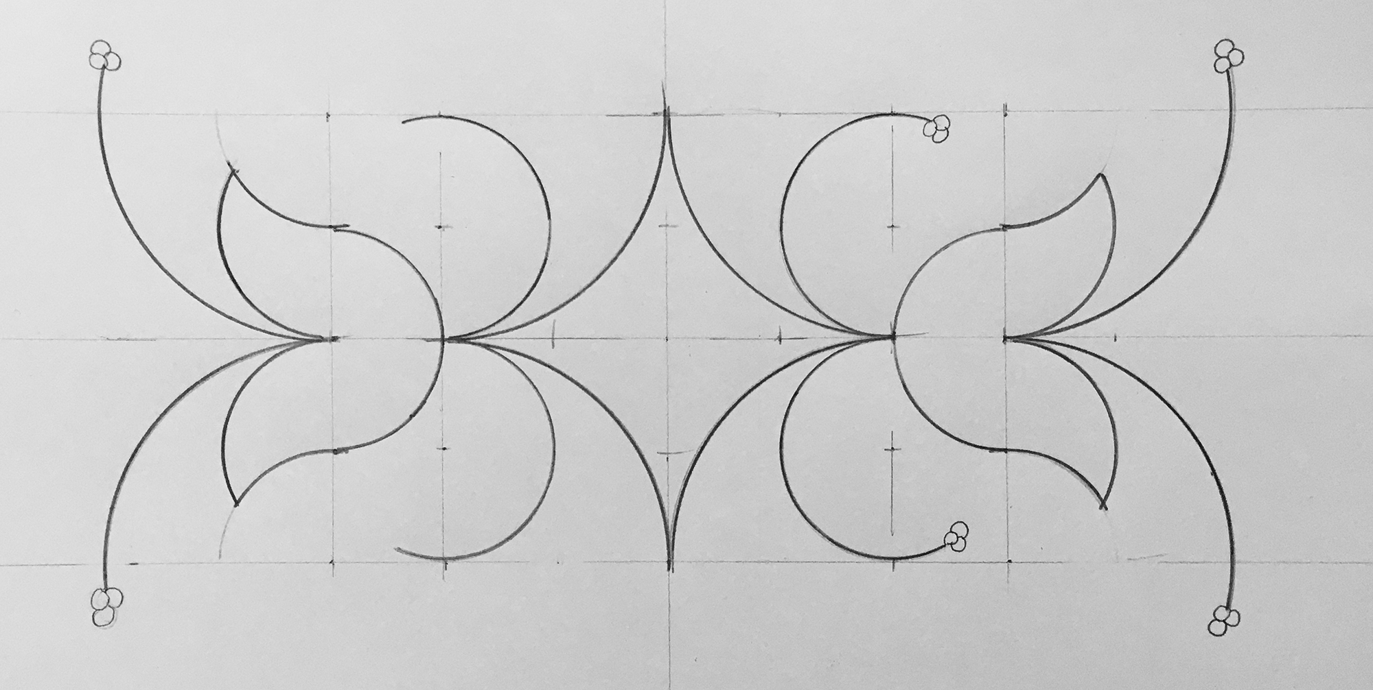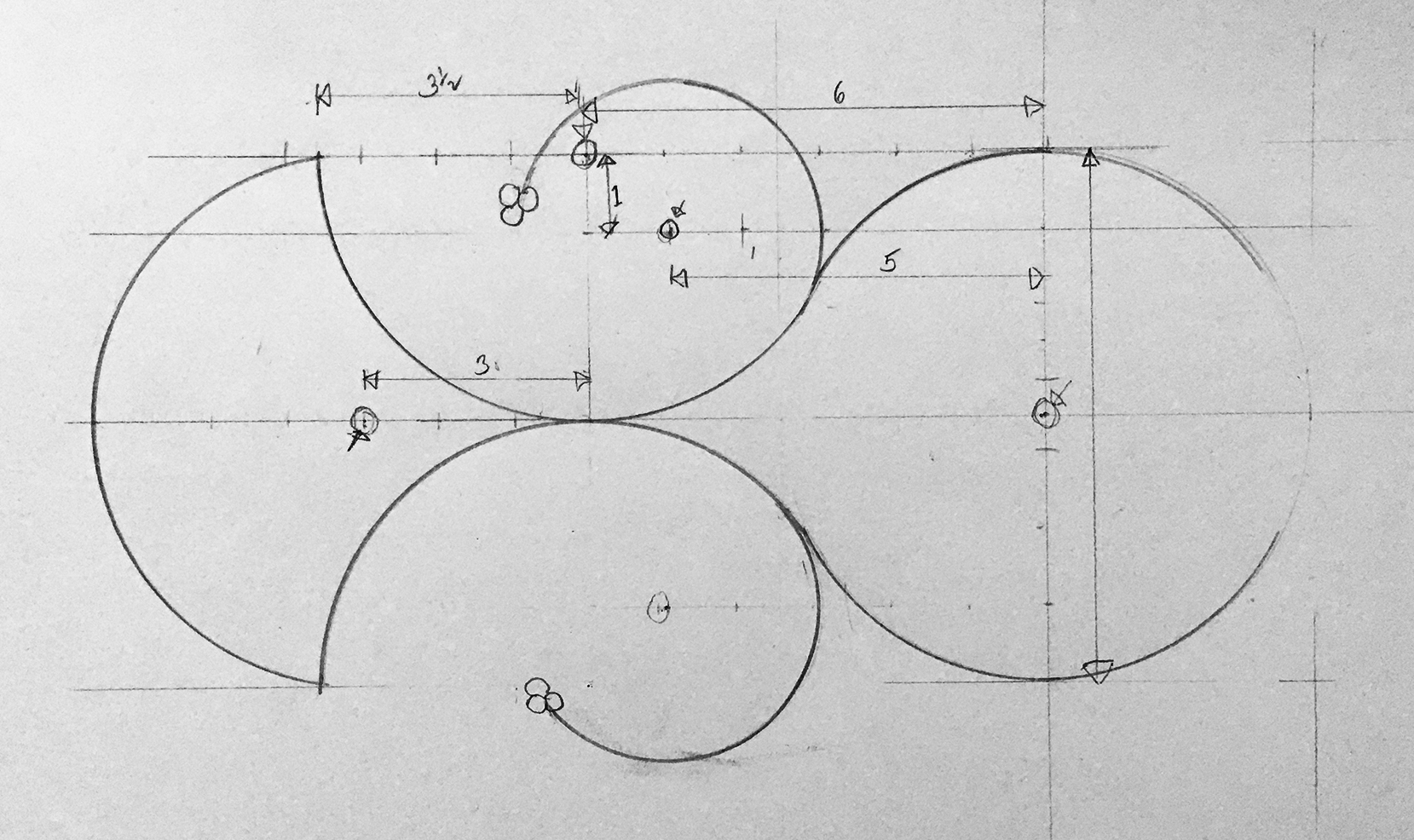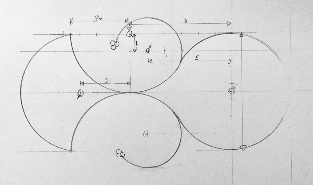 Only two radii are needed to generate this design. The diameter of the central element is divided into to seven equal segments. Combinations of 3, 3 1/2, 5, and 6 of these segments determine the placement of the fixed leg of the dividers to complete the design. Drawn by the author.