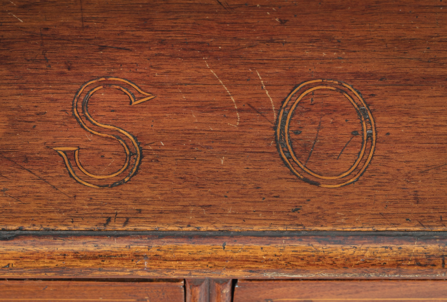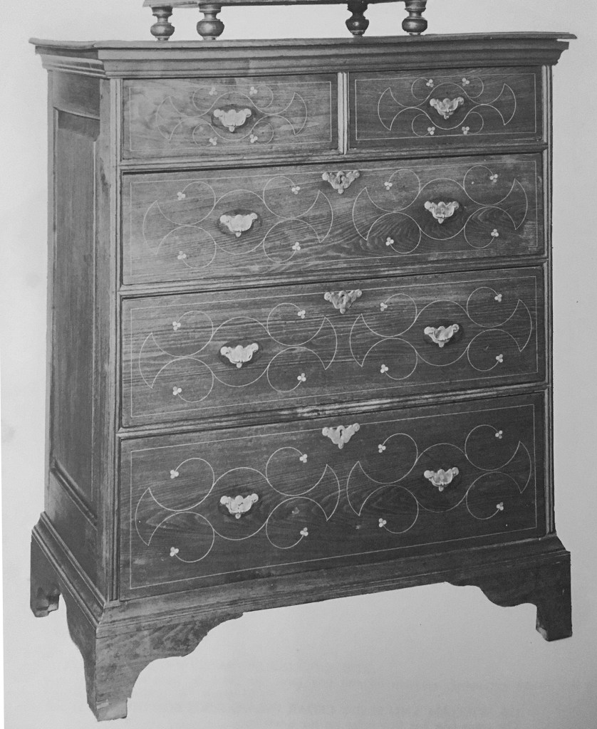 Several objects attributed to Chester County, Pennsylvania in William “Bill” du Pont’s collection have related line-and-dot inlay on their facades.