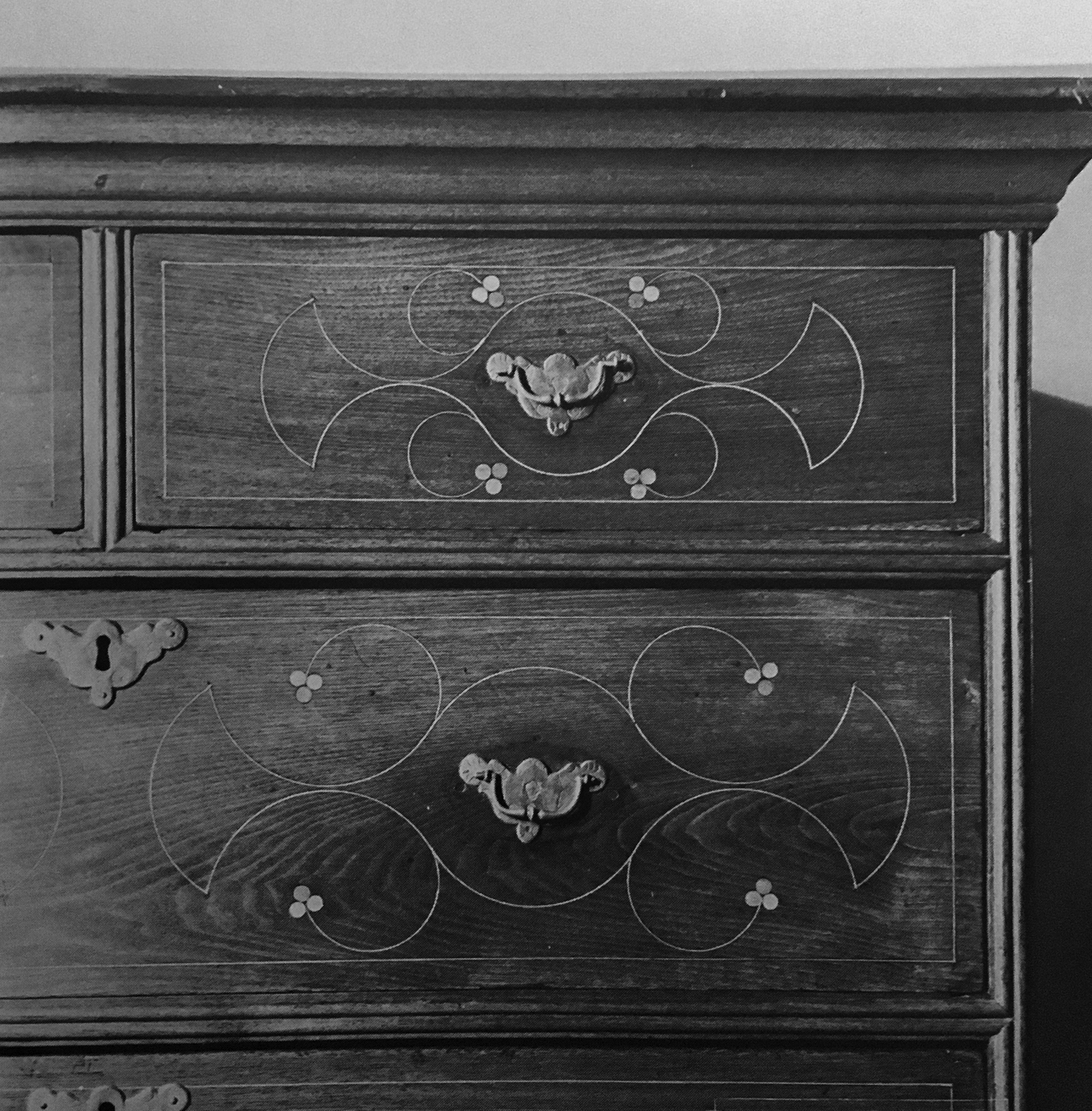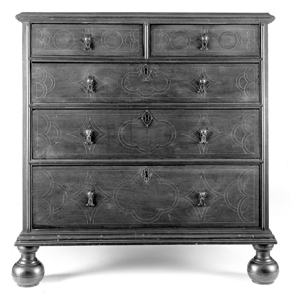 Chest of drawers with line and dot inlay. Chester County, Pennsylvania. Circa 1711. Black walnut, yellow poplar. Replaced feet and brass pulls. Private collection