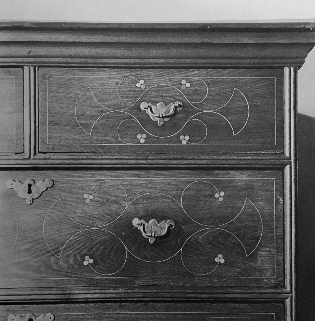 The elaborate line and dot inlay designs present on the drawer fronts of these chests has long been associated with central and southeastern Chester County. Similarities of the chests include overall dimensions, joinery, inlay, moulding profiles, secondary wood species, and the use of single-pull brass fittings. The chest in the collection of the Dietrich American Foundation is the only chest that survives with its original front ball feet.