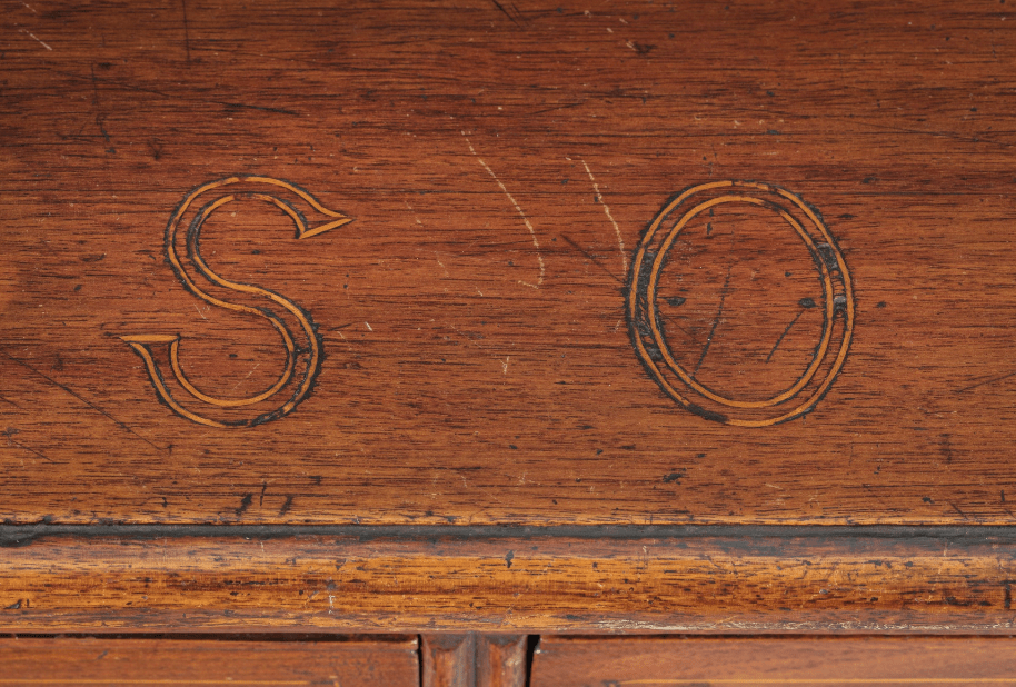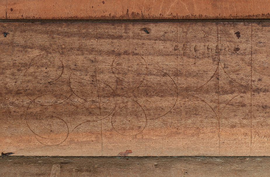 An auction catalogue entry suggests the “SO” initials inlaid in the top of the first chest above refer to Sarah Ogden (b. 1691), a member of the prominent Ogden family of Chester County, Pennsylvania. She was the daughter of David Ogden (1655-1705) who immigrated from England with William Penn in 1682. He later settled in Middletown, Chester County. (Middletown remained part of Chester County until 1789 when Delaware County was created from the southeastern portion of Chester County.) David and his wife, Martha Houlston (married 1686) had 9 children. Sarah married Evan Howell (died 1734) in 1711 in Whiteland, Chester County.  A related chest of drawers with the initials “MO” has a history of descent in the Ogden family of Chester County and may have originally been owned by Sarah’s sister, Martha (born 1689).  That chest is in the collection of the Gloucester County Historical Society in Woodbury, New Jersey (acc. No. 1916.41). If this information about the ownership of the chests is correct, we can assume the chests were made around the time of Sarah and Martha Ogden’s marriages. Incised lines made with dividers on an interior surface of the “SO” chest shows the joiner working out a drawer front stringing design. Interestingly it does not correlate with the drawers of this chest as closely as it does with others produced in this shop which employ diamond shapes at the center of the pattern where they surround the single-drop brass pulls. The incised vertical lines are very much a part of how these designs are constructed. The radii and divisions of the circles they create are used to locate the fixed leg of dividers when creating the designs. As I mentioned previously, dividers are used to design stringing inlay patterns, but a different tool is used to cut the channels for the stringing in the wood surface.