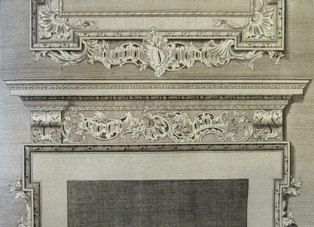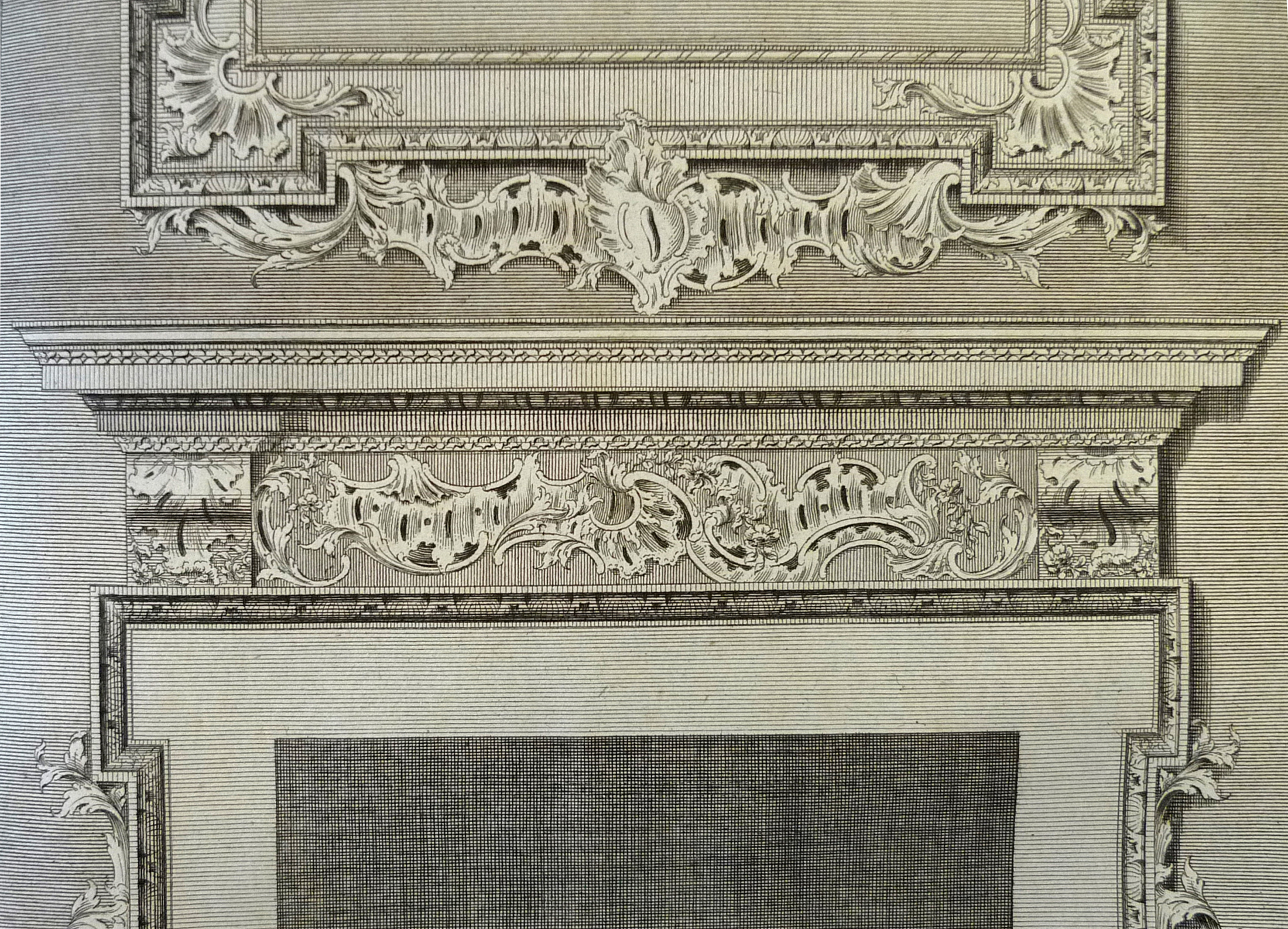 On the left, console bracket in the dining room at Mount Pleasant, right detail of plate 50, “The British Architect.” I’ve wondered whether the carpenters installed the brackets flipped from the carvers intended orientation.