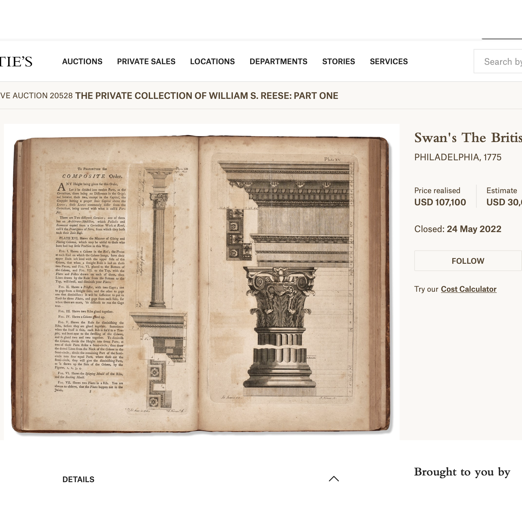 From the private collection of Bill Reese sold at Christie’s, Swan’s, The British Architect: or the Builders Treasury of Stair-cases. Philadelphia, 1775: R. Bell for John Norman 1775. The first architecture book printed in America, a reprint of Abraham Swan’s influential design book.