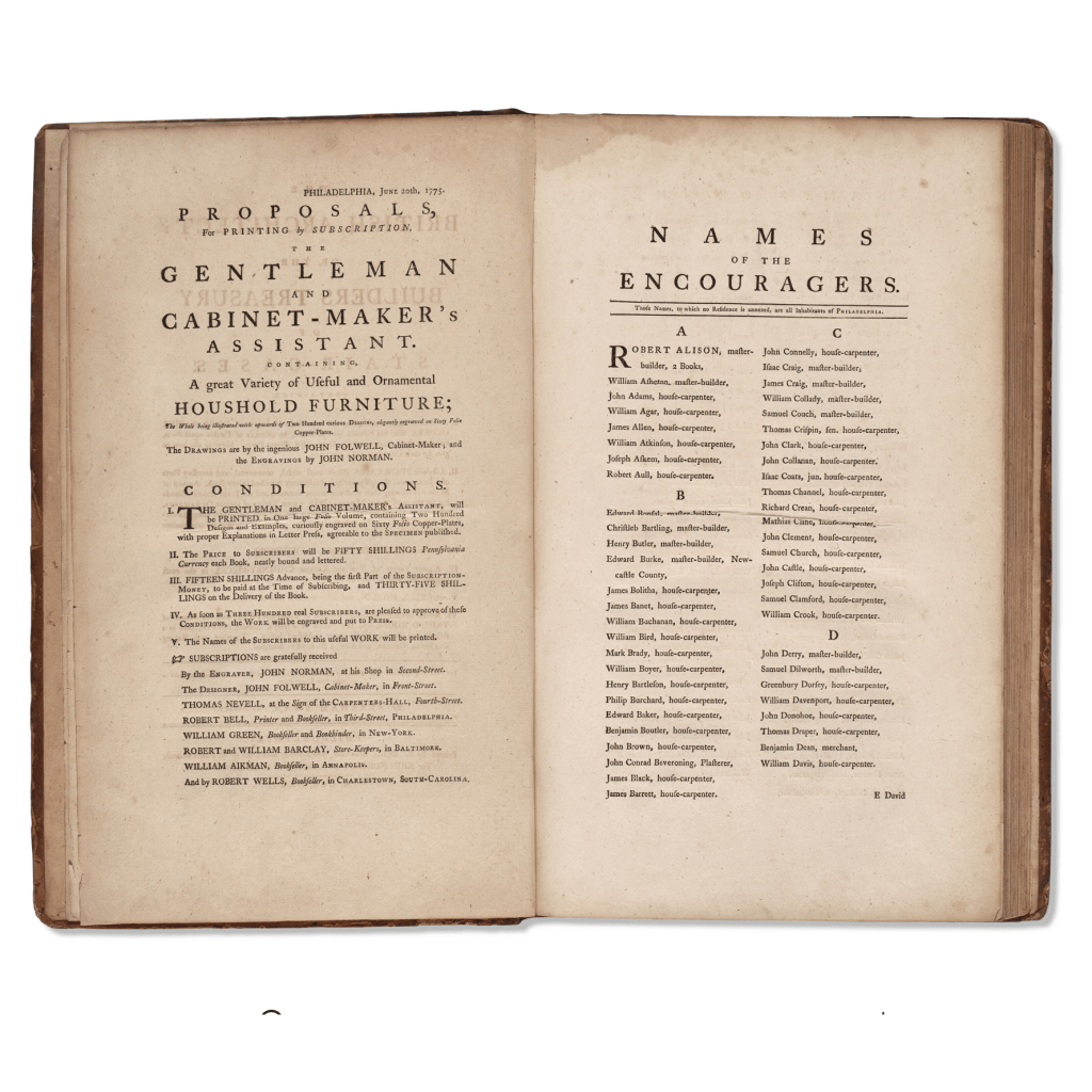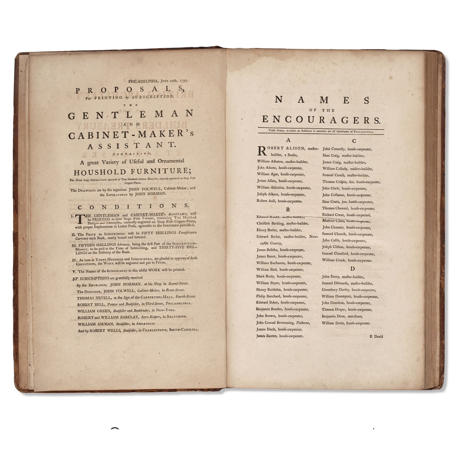 “This copy with two prospectus leaves, for John Norman and John Folwell’s The Gentleman and Cabinet-Maker’s Assistant, dated June 20th 1775; and for Abraham Swan’s A Collection of Designs in Architecture, dated June 26th 1775. Because of the war, the former work was never published. Norman, an Englishman, first arrived in Philadelphia in 1774, and in the same year he submitted a proposal to publish the present work, “a handsome reprint of Abraham Swan’s The British Architect”