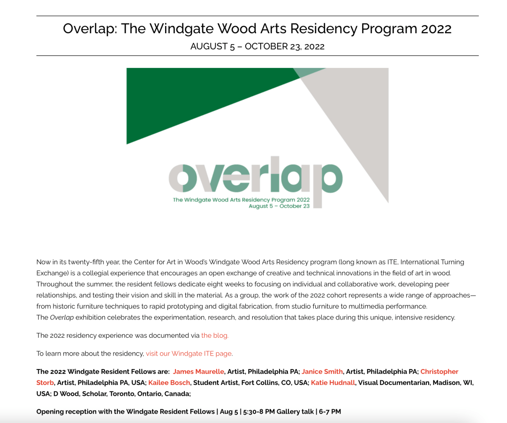 The Windgate Wood Arts Residency Program 2022 is winding down. Installation of our exhibition begins next week and the opening reception – free and open to the public – happens Friday, August 5, 5:30-8 PM. Of interest to those who have followed the previously named Windgate ITE (International Turning Exchange) over the last 25 years, the residency program has a new name, reflecting the broader scope of work produced by the fellows. For many years, the exhibition at the end of the residency was titled “allTURNatives: Form + Spirit.” But this year, in addition to the change of the residency name, our group had the opportunity to title our exhibition. Several ideas were put on the table but we quickly agreed on Overlap, reflecting the wide range of approaches to our work as described in the exhibition announcement above.