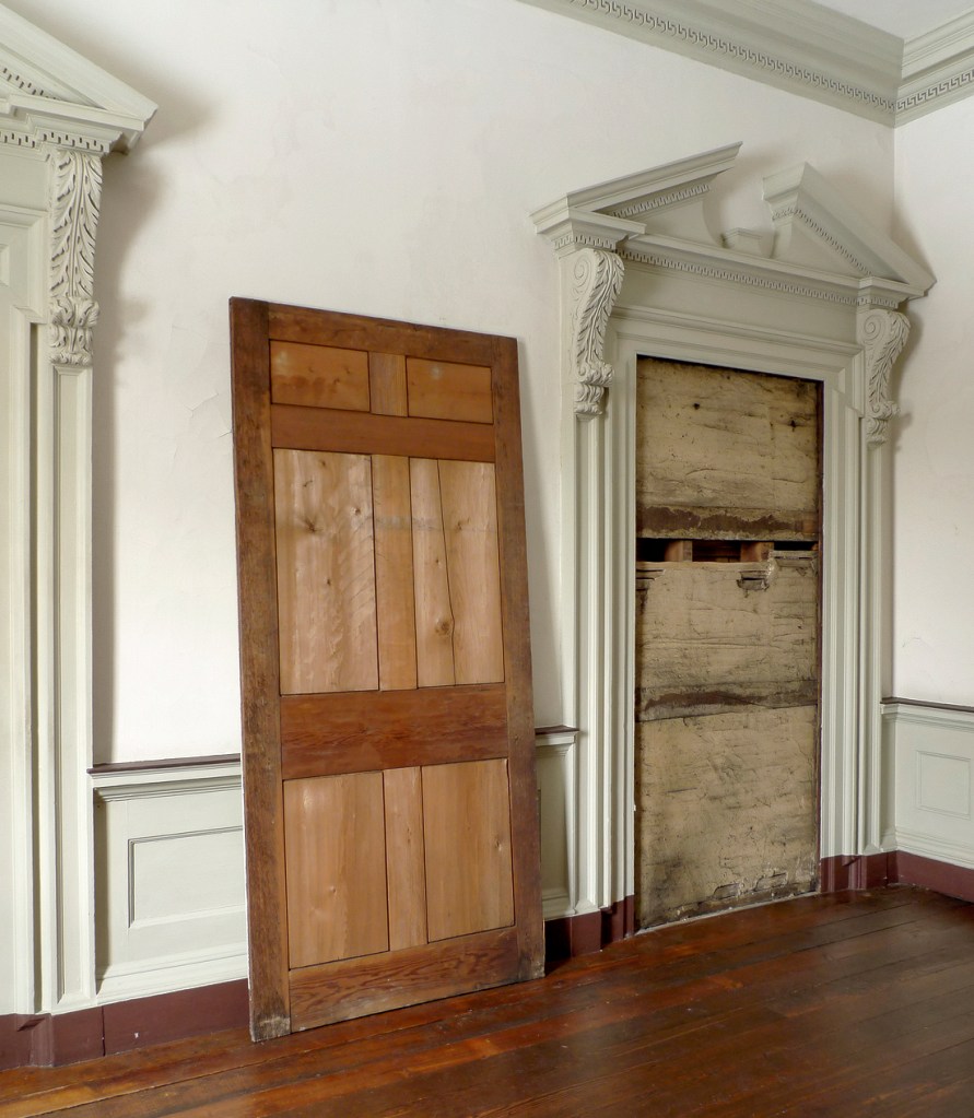 Good catch on the bottom of the casing miters. This happens throughout the house, not just on doors with the addition of carved trusses outside the casing. A good architectural post for the future.