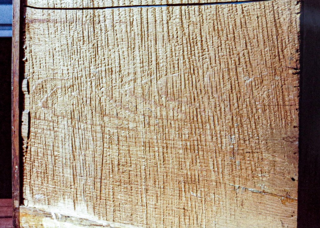 A shell-carved drawer from a c. 1760 dressing table made in Philadelphia. Raking light shows the tracks left by a fore-plane with a cambered iron pushed along the grain of a riven Atlantic white cedar bottom board. The plane easily removed the rough split surface left from riving. Using the versatile fore-plane, a joiner brought the board to the desired thickness while at the same time giving it a reasonably flat surface on account of the planes flat bed/bottom. The front edge of the bottom of the drawer was tapered with a smoothing plane running across the grain, fitting it to a groove in the drawer front. This type of finish on secondary surfaces – areas that would not usually be seen- was acceptable to clients at the time.This a a drawer made in late seventeenth century New England. Here you are looking at saw-kerf marks left after resawing a thicker board, probably in the shop where it was made, to produce a thin, light weight drawer bottom. The upper surface of the drawer bottom would have looked like this before a fore-plane removed the saw marks and a smoothing plane removed the hollows – called dawks by Moxon – and peaks left from the fore-plane.This is the underside of a dust-board in an early eighteenth century chest of drawers made in Philadelphia. The identical process used on the drawer bottom in the first image was used here. The upper surface the drawer runs on is planed smooth just as he upper surface of the drawer bottom. The iron of the fore-plane used on this board was shaped to a more gentle curve than the irons of the planes used on the boards seen in the earlier images. We can also see that the iron’s cutting edge had multiple nicks that produced raised lines of wood in the hollows/dawks. Since fore-planes were typically not used to produce a finished surface, time was saved by not having to remove the iron from the plane and taking it to the grindstone and/or sharpening stones to remove the nicks.The fixed door in the drawing room at Mount Pleasant, built 1763-1765 in what is now East Fairmount Park in Philadelphia, was removed for examination. It was made with hard pine stiles and rails and a combination of white pine and Atlantic white cedar panels.The hard pine vertical stile on the left has saw-kerfs left from a water mill. The hard pine lower rail was brought to the desired thickness with a fore-plane as were the other elements of the door. After the door was assembled, the pine panel on the left had to be further reduced in thickness. A fore-plane was pushed diagonally across the grain and was stopped as it hit the center stile of the door. No further work with planes was necessary as this side of the door would not be seen after it had been installed.A fore-plane was used to taper the sides of a panel of another fixed door at Mount Pleasant to fit grooves in the stiles, leaving the kerfs from mill-sawing over most of the panel. Chatter marks are present in the dawks left from the fore-plane with its iron set rank, pushed quickly through the soft white pine.