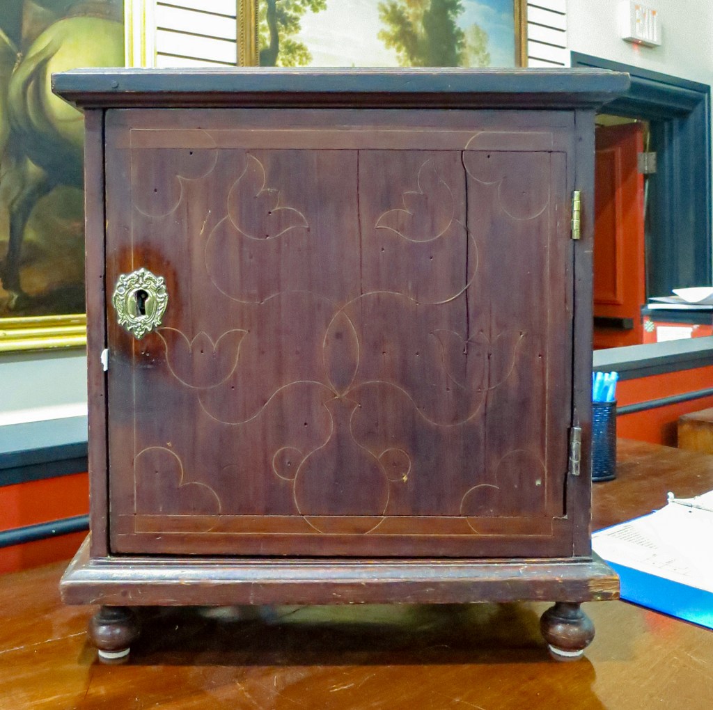 Last year at this time I was writing about furniture in Bill DuPont’s Rocky Hill collection at auction at Sotheby’s with the idea that a number of early eighteenth-century objects in his collection would have been attributed to Philadelphia had they not been inlaid. Though it has been written that “It is probable that line-and-berry ornament was first used on early Philadelphia furniture; however, to date no such examples can be firmly documented” there has long been evidence for “line-and-dot” work being done in Philadelphia. While this spice box has no inlaid “dots”, its secondary wood species and use red cedar as a primary wood suggest it was more likely made in the Delaware River Valley rather than Chester County.