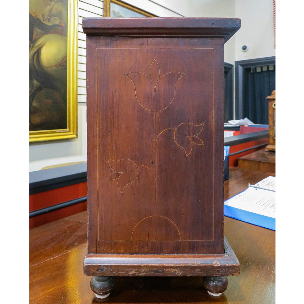 Margaret Berwyn Schiffer’s collection of furniture and decorative art was auctioned at Pook & Pook, Ltd. on January, 18, 2023. Of particular interest was this spice box made of red cedar with light-wood line inlay on the door, sides, top, and interior drawer fronts. Schiffer owned the spice box when she first illustrated it in “Furniture and Its Makers of Chester County, Pennsylvania,” 1966, University of Pennsylvania Press. Her book was republished in 1978 by Schiffer Publishing, Ltd, Exton, Pa. The inlay on the top of the box was not at all visible in the photos in the book and that on the side was barely readable. I examined and photographed the spice box during the preview prior to the auction.