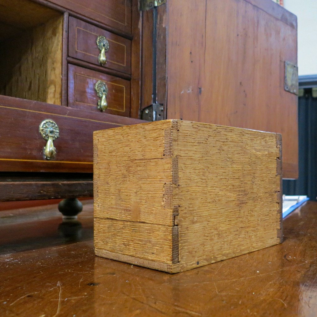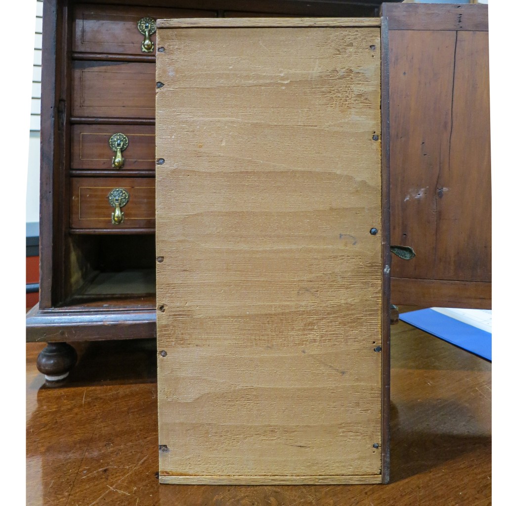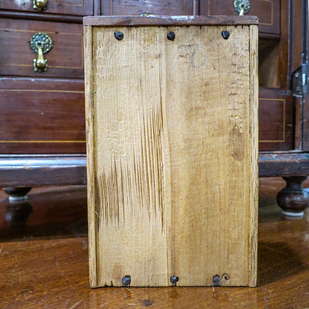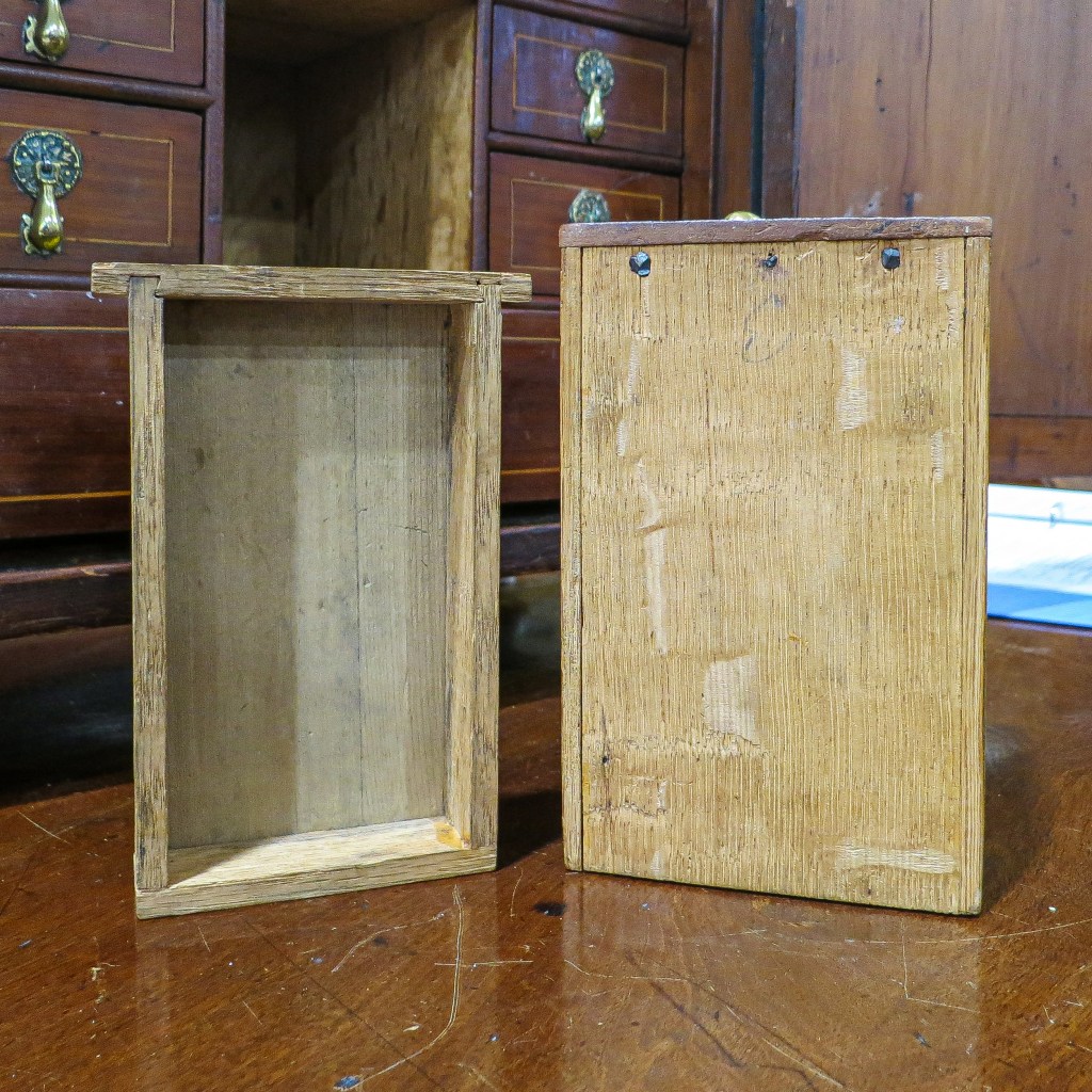 I was hoping to find inscriptions on the box itself, but only found chalked numbers on the drawers to indicate their arrangement within the case. One of those numbers, a “3,” was partly covered up by the construction of the large middle drawer. That indicated to me that it and the other drawer numbers in a similar hand were face marks applied by the maker, and not by someone later.