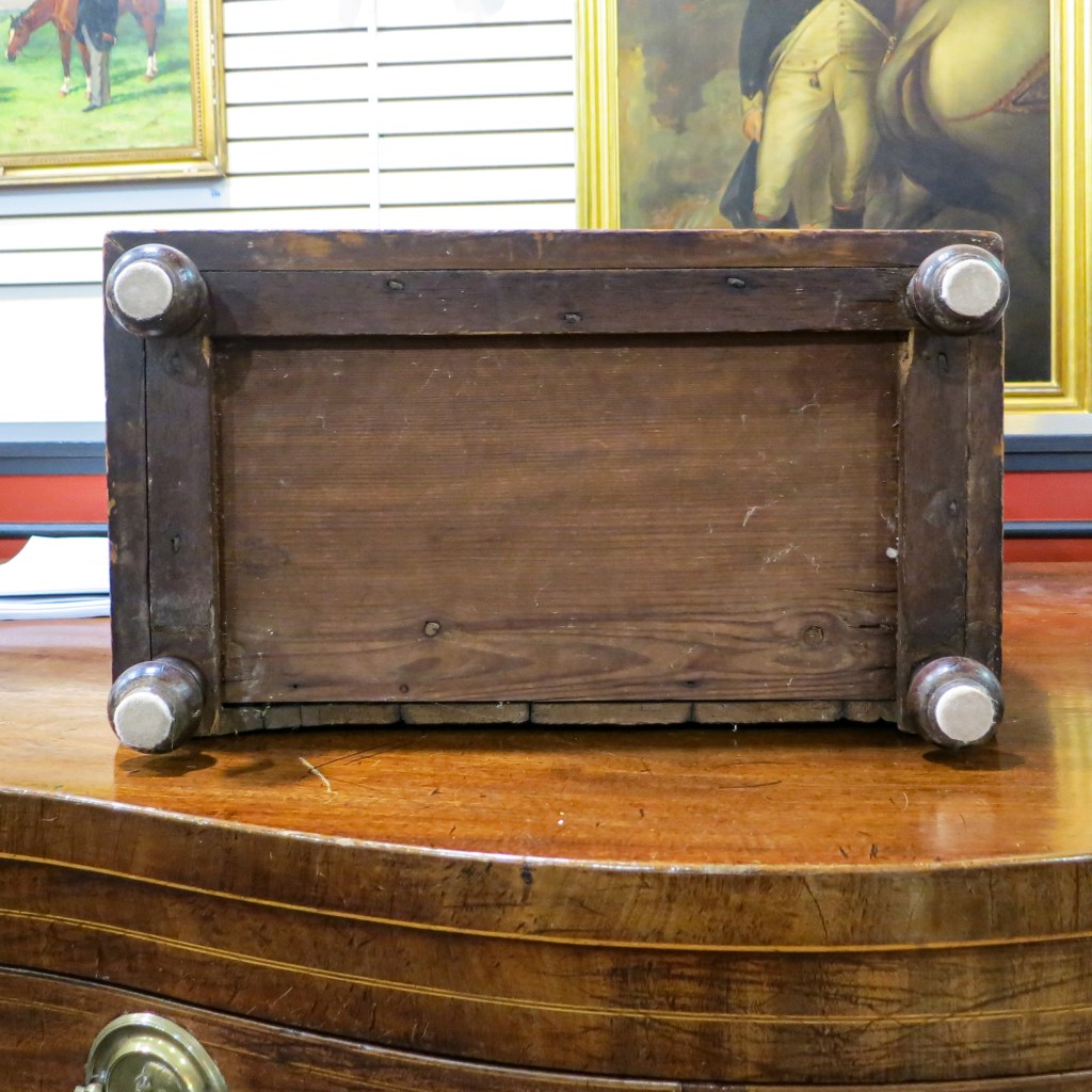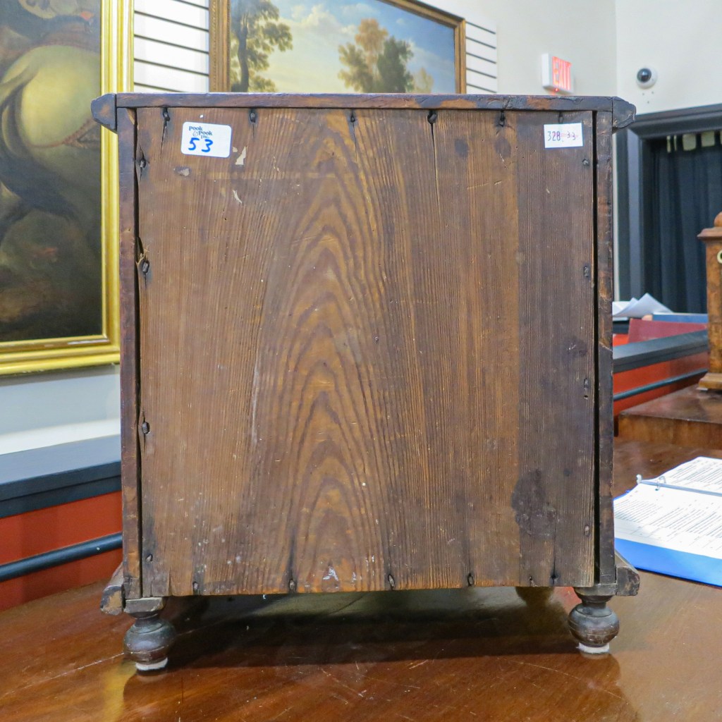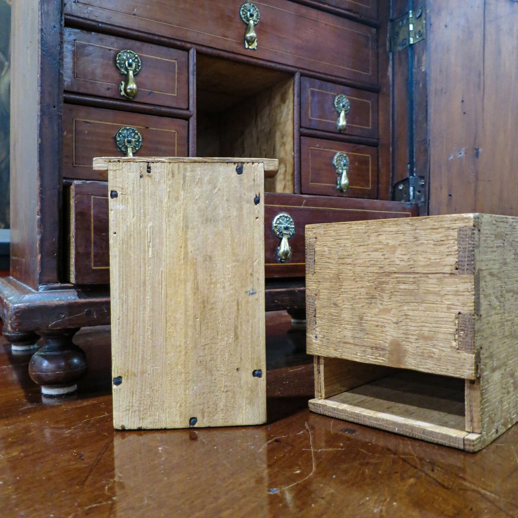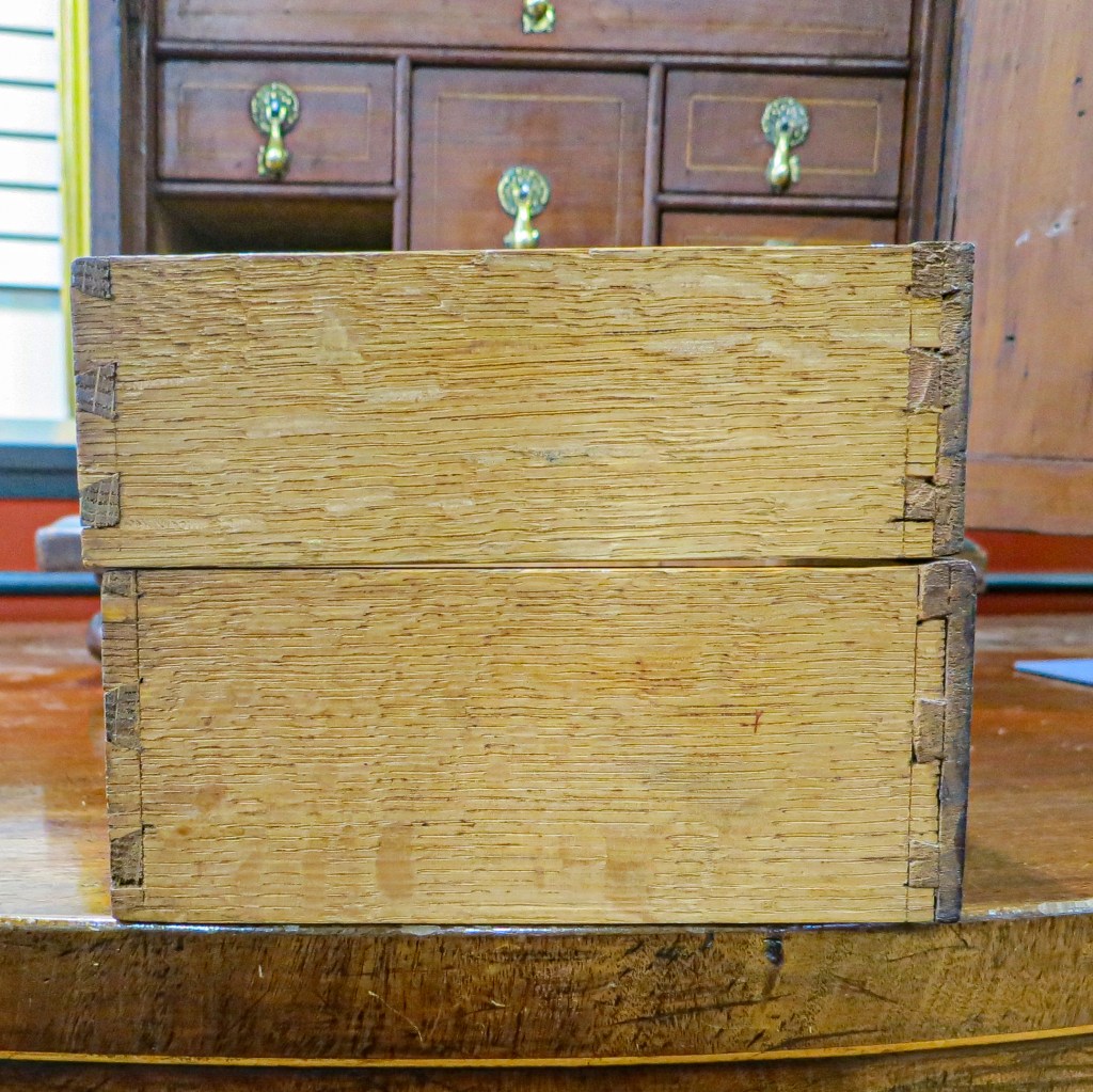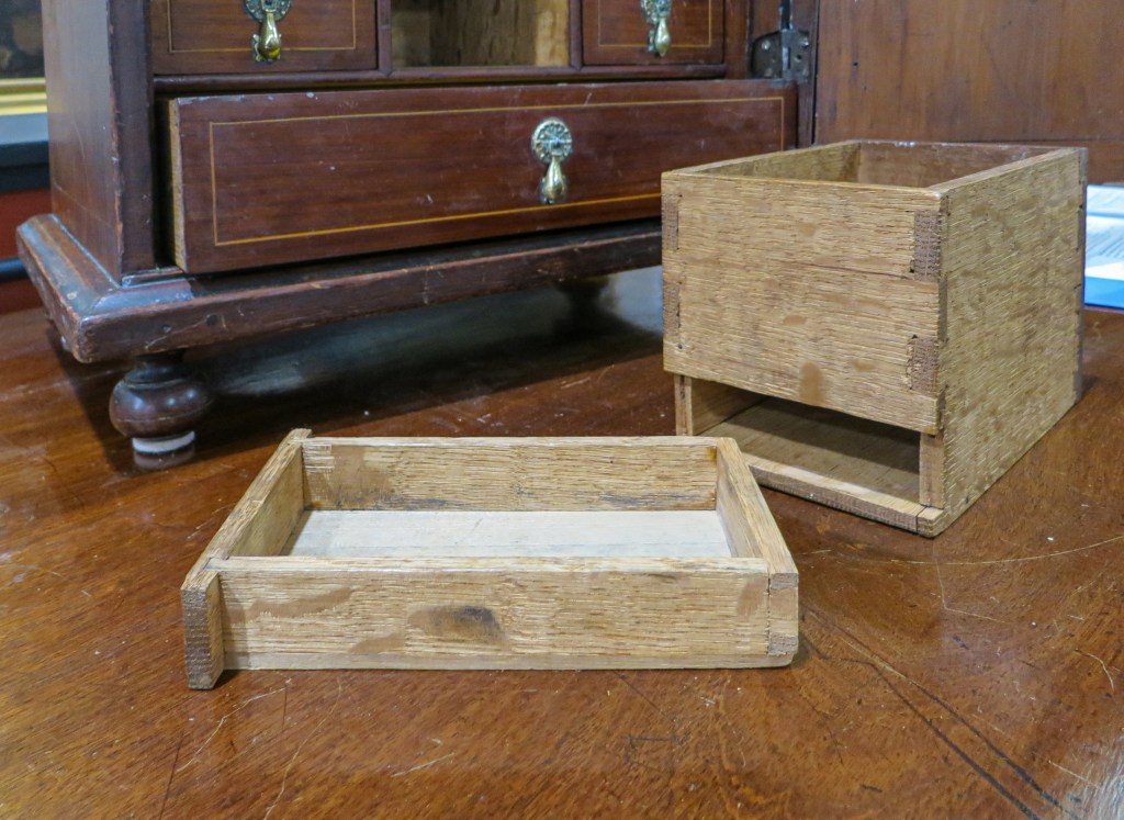 I was hoping to find inscriptions on the box itself, but only found chalked numbers on the drawers to indicate their arrangement within the case. One of those numbers, a “3,” was partly covered up by the construction of the large middle drawer. That indicated to me that it and the other drawer numbers in a similar hand were face marks applied by the maker, and not by someone later.