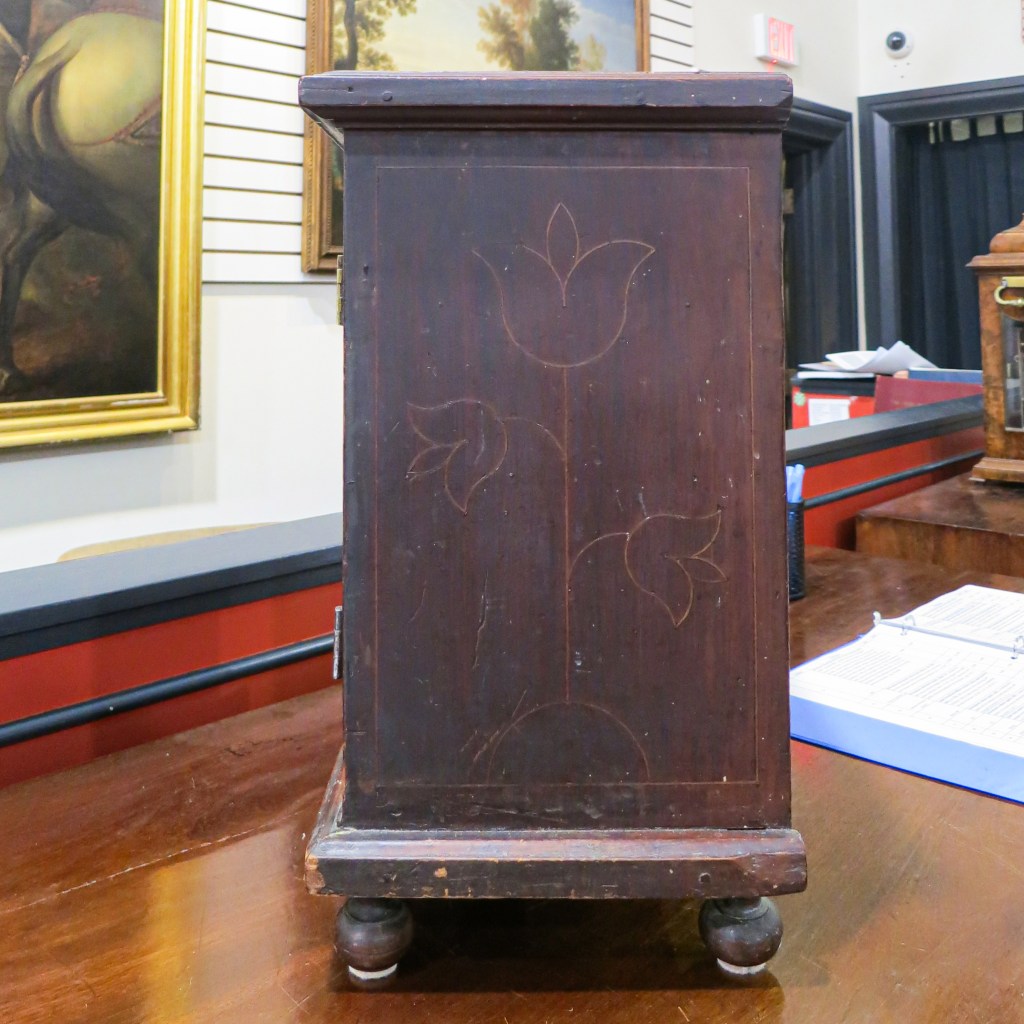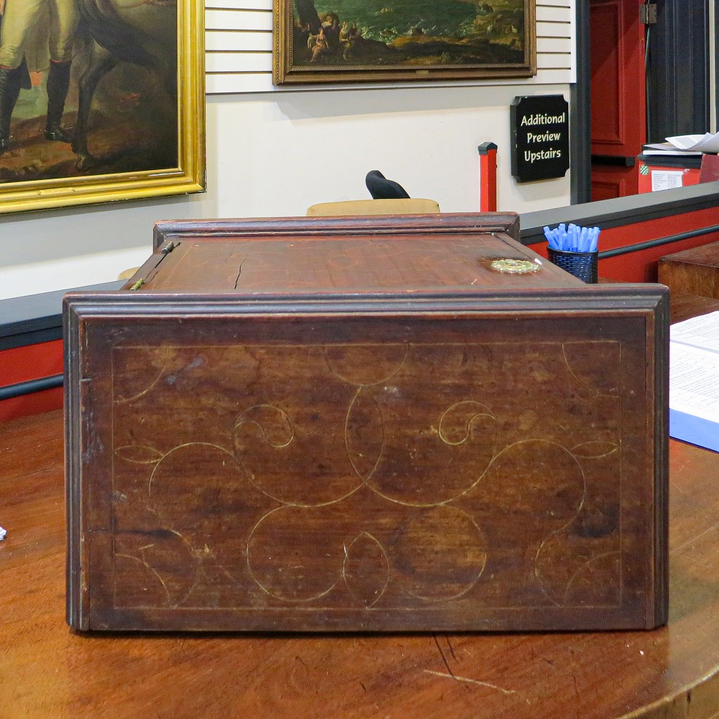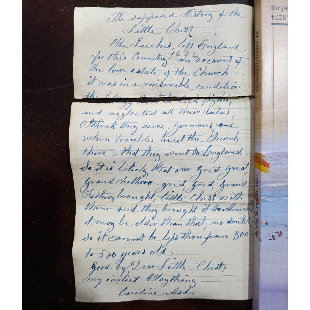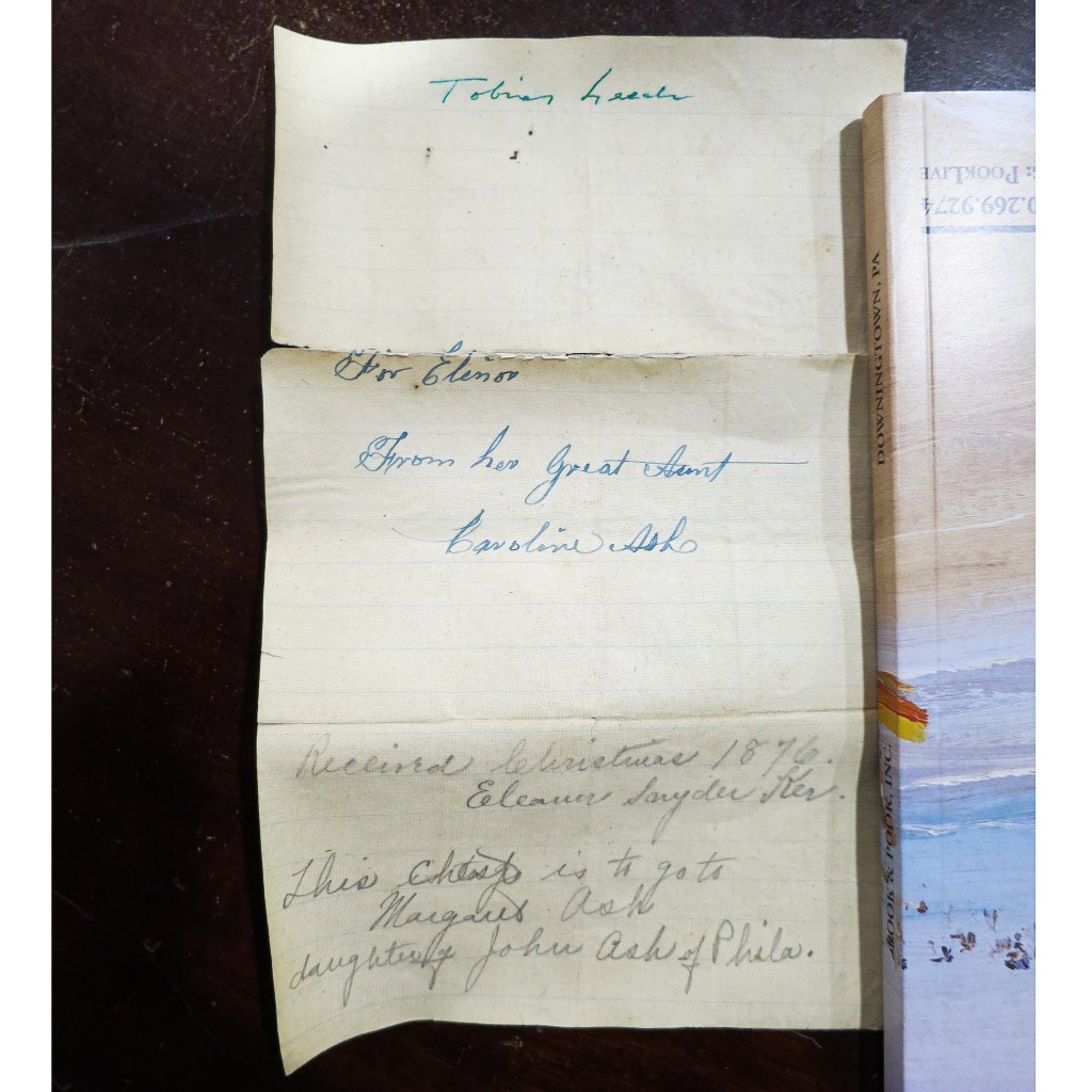 3. I photographed Caroline Ash’s note as well and pursued some research. I could not find a connection between the Leech and Ash families in Philadelphia. Perhaps it came from the Leech family down through her mother’s family. Given the inaccuracy of her note as to where the chest was made, her assumptions as to provenance may also be incorrect.