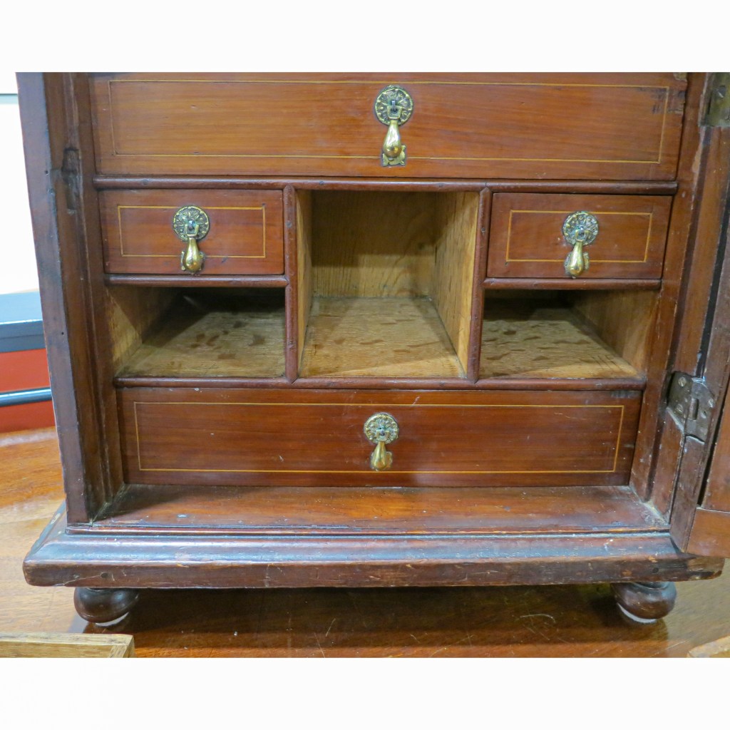 I found this detail fascinating. Where the bottom of the drawer pulls hit, a small brass-headed spike or sprig with a decorative-filed edge is nailed in place preventing the pull from marring the drawer front and inlaid stringing. It worked.