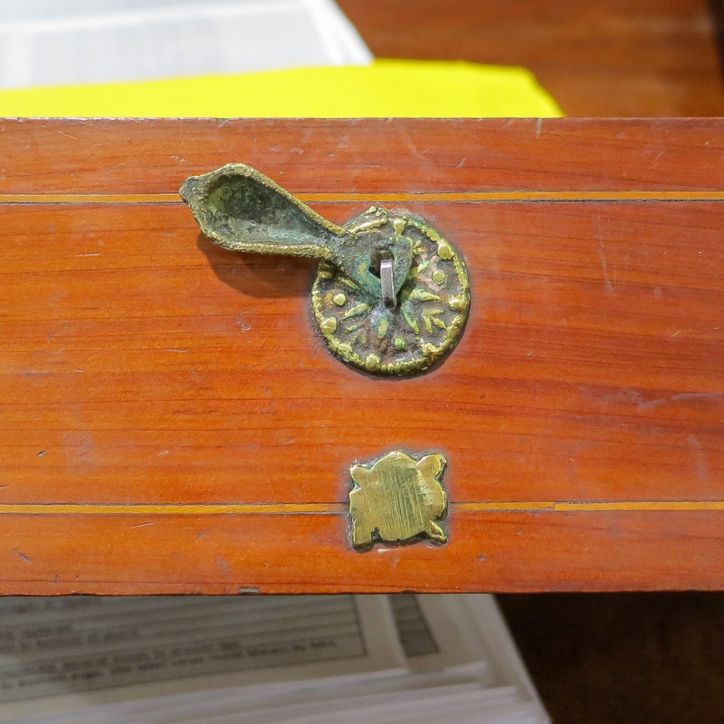 1. The brass drop pulls remind me of miniature door knockers with a strike plate. The drop pulls with their round rosettes were obviously made in England. I am wondering if the “strike plates” could have been made in the same area as the spice chest? They do not have the same level of craftsmanship as the drop pulls.