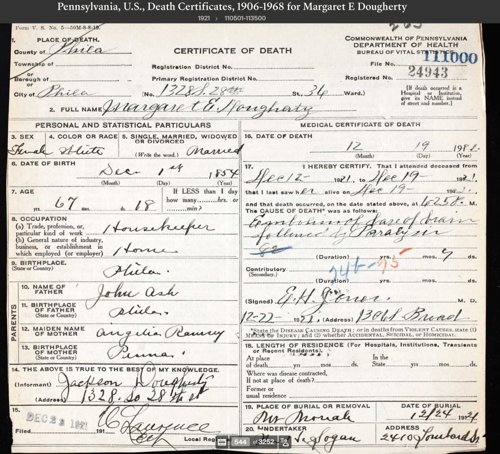 The most surprising line in the Pook & Pook catalogue description of the spice box for me was: “An early note accompanying this lot discusses the history of the chest and its descent in the Leech family, written by Caroline Ash …” Schiffer made no mention of this in her book. Why this was so we can only speculate, but this is invaluable information to have about the spice box. This might be one of the very few spice boxes that can be documented to have been owned by generations of Philadelphians. Caroline Ash may have been mistaken about the age and origin of her spice box but it is clear she took exceptional care of it based on its condition today, and lovingly passed it on to her great – or grand – niece, Eleanor. If Caroline was using the term “Great Aunt” as we do today, she would be the sister of one of Eleanor’s grandparents. The catalogue calls Caroline the daughter of John Ash, but it is actually Margaret Ash, to whom Eleanor bequeathed the box, that is the daughter of John Ash of Philadelphia. There are five family names on this note and one date – Christmas Day 1876 – the day Eleanor received the spice box.