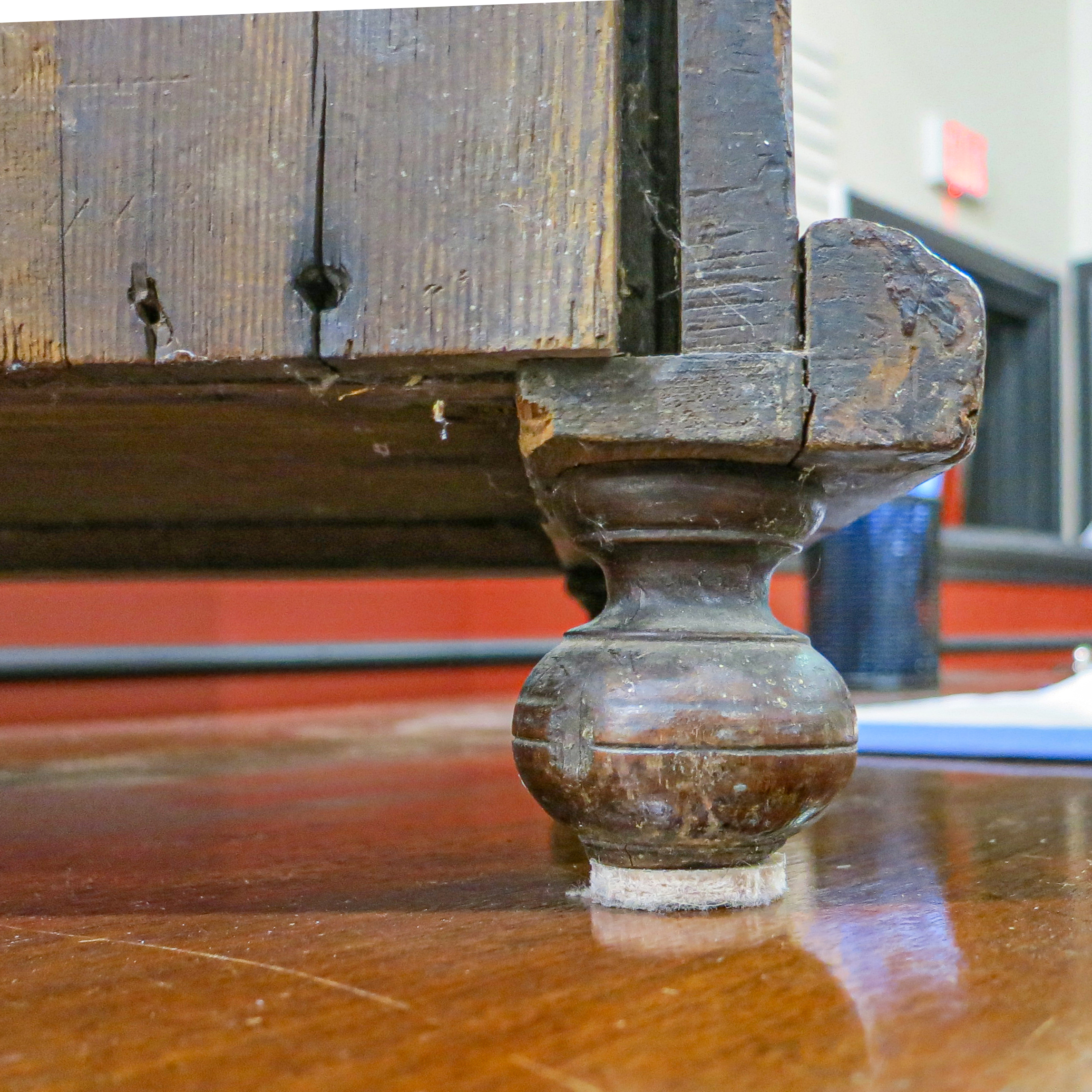 Red cedar was prized for its brilliant color and pleasant smell, but after time, these properties faded. Ultimately it would be mahogany that replaced red cedar for its similar color and the added benefit of more dramatic grain figure. The drawers of the spice box, protected by a thin varnish and door that would be closed most of the time, allow us to see the brilliance of the wood as it would have looked when first made into furniture and room paneling.