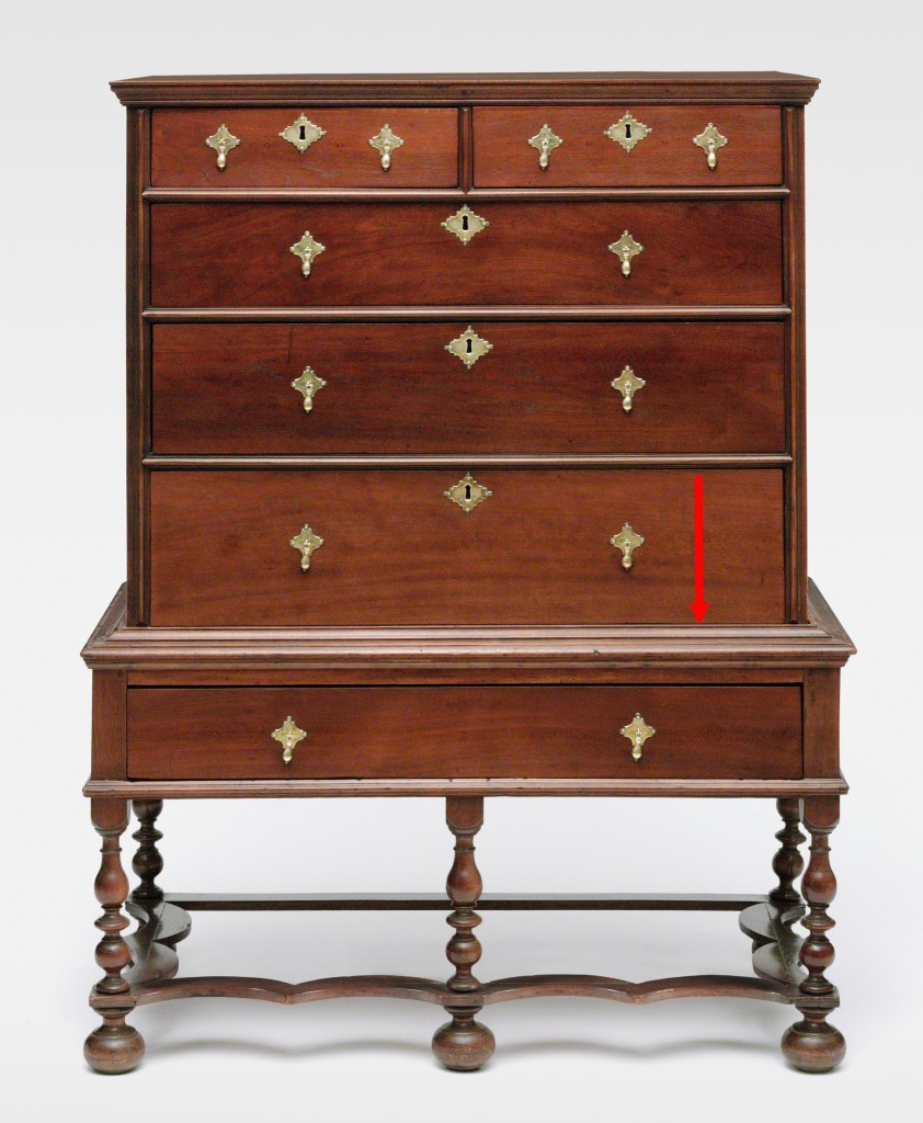 The lower drawers of spice boxes or full size chest of drawers sat just above either the mid or bottom mouldings as seen on this chest of drawers on a frame made in Philadelphia c. 1715. In Widdifield’s sketches of the spice box and a chest of drawers on a frame there is no indication of a hinge board as there is in the sketch of the scruetore, evidence that the sketch was intended to accurately portray a writing desk with a lockable fall.