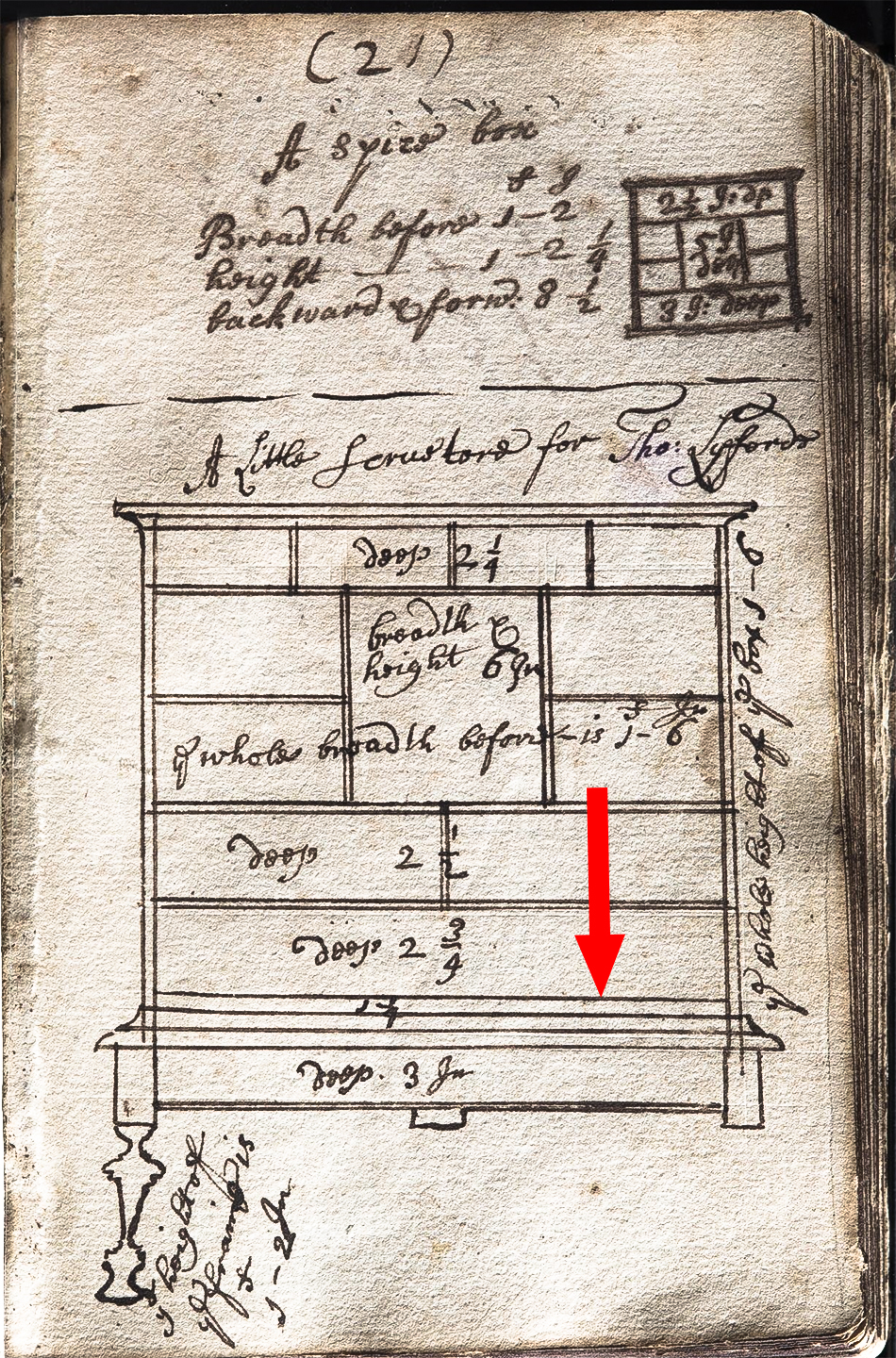 For this initial entry about Widdifield, I want to add to the article’s discussion of page 21 of his notebook which has drawings of a spice box and a “Little Scruetore for Tho: Lyfords.” The article’s description, “A page with the heading “spice boxes” has a sketch with the notation, “A little Scruetore for Thomas Lyfords” is slightly misleading. There is no heading that reads “spice boxes.” At the top of the page Widdifield writes “A spice box,” draws a picture of a nearly square spice box with measurements for the heights of the drawers. To the left of the drawing are measurements for the “Breadth before” (width), “height,” and “backward and forward (depth) of the spice box. Underneath this, separated by a dashed line, is a measured drawing of “A Little Scrutore for Tho: Lyfords” which resembles a spice box on stand. The article speculates that “it was a tabletop form—possibly having a fall front—patterned after a spice box.” But there is no need to speculate, Widdifield’s drawing clearly shows that it is designed for a fall front. The arrangement and measurements of the drawers would be obscured if he represented a fall in the closed position.